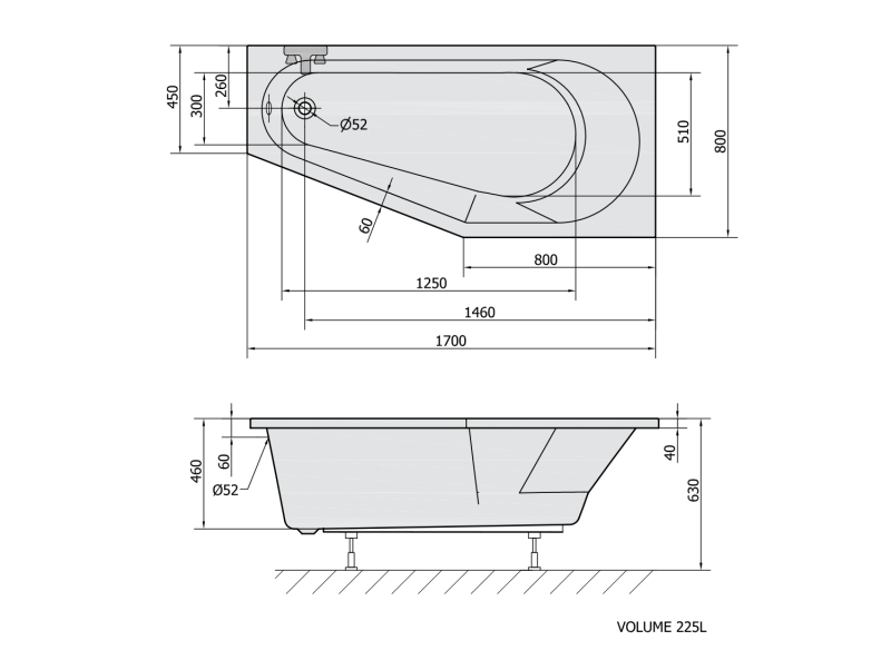 TIGRA R asymetrická vana 170x80x46cm, bílá 90611
