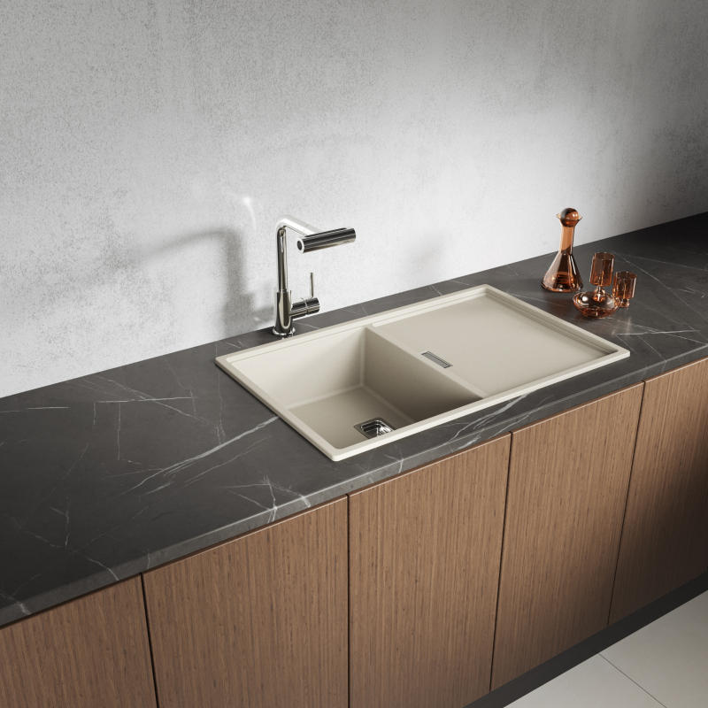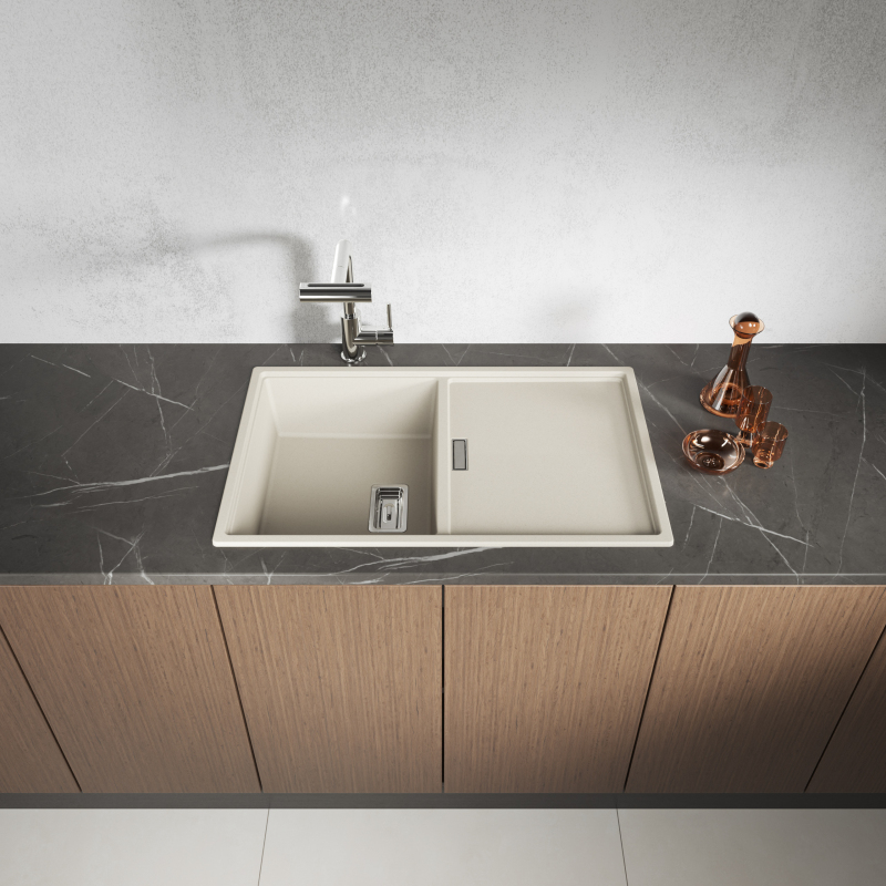 Dřezy Tonga jsou k dispozici ve třech elegantních barvách – béžové, černé a šedé, které se hodí jak ke klasickému, tak i modernímu uspořádání kuchyně. Decentní barvy umožňují volnou integraci s různými povrchy a doplňky a vytvářejí tak ucelený a stylový prostor. Pro ty, kteří hledají výjimečná řešení, jsou na vyžádání k dispozici také v jedinečném odstínu Future Dusk.