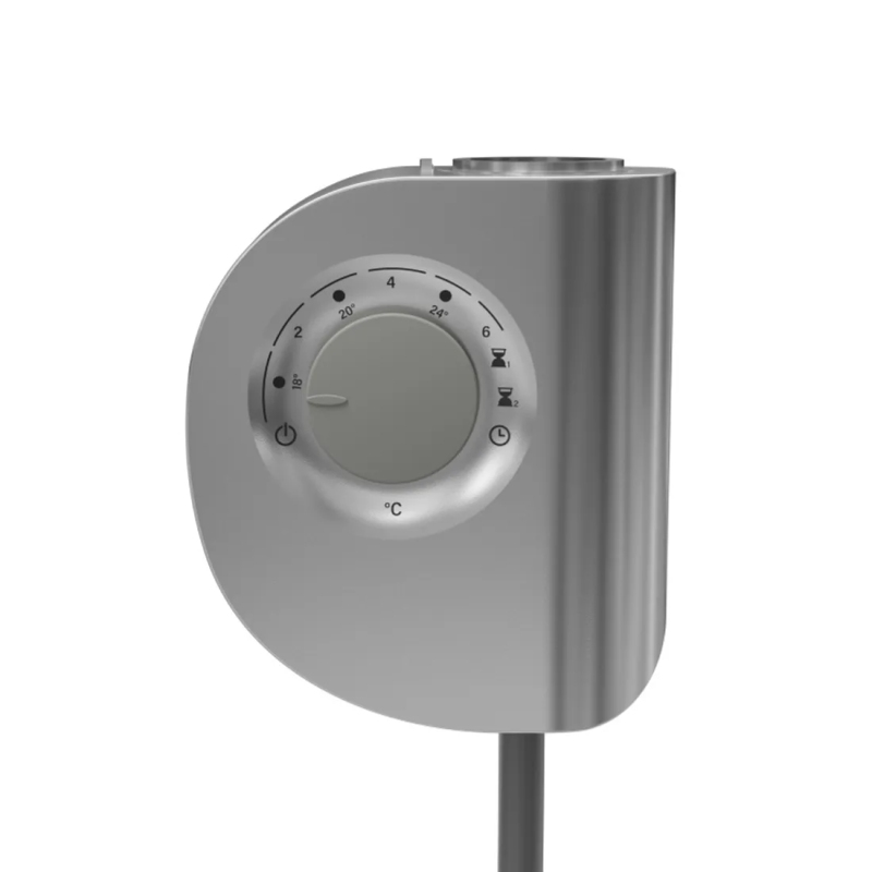 Regulátor s otočným kolečkem, pomocí kterého je možné nastavit až 5 režimů. Program pracuje na základě časových úseků a nastavení teploty zadaných uživatelem. Tento se automaticky opakuje každých 24 hodin. Pomocí zařízení lze nastavit teplotu v místnosti na jednu z předvolených hodnot (18 °C, 19 °C, 20 °C, 22 °C, 24 °C nebo 26 °C). Zařízení automaticky zapíná a vypíná topné těleso prostřednictvím relé, aby udrželo zvolenou teplotu. Regulátor disponuje praktickým otočným ovladačem umožňujícím nastavení různých režimů provozu podle potřeby. Pohotovostní režim: Topné těleso připojené k regulátoru není napájeno. Režim Komfort: Regulace okolní teploty je umožněna pomocí až 6 nastavitelných teplotních hodnot, které uživatel nastavuje prostřednictvím otočného ovladače. Časovač 1 (Boost 1): Regulátor napájí topný článek plným výkonem po dobu 1 hodiny, poté se topné těleso vypne. Časovač 2 (Boost 2): Regulátor napájí topný článek plným výkonem po dobu 2 hodin, poté se topné těleso vypne. Denní časový režim (Daily Chrono): Regulace okolní teploty je aktivní s nastavenou teplotní hodnotou během denního časového úseku (v délce 4 hodin), který je naprogramován uživatelem. Režimy: pohotovostní režim, komfort, časovač 1H/2H, denní program, detekce otevřeného okna. Provozní napětí: 230 V/50 Hz, třída ochrany: I, pracovní teplota: 0-50°C, pracovní vlhkost: 85 % při 25 °C (bez kondenzace), rozsah teplot místnosti: 18-26 °C: pravá, sběrnice (vlevo pouze na základě specifikace v objednávce). Připojovací závit: G 1/2” vnější (na topné tyči), připojení: rovná šňůra 120 cm ukončená vidlicí, ochranná zóna: 2 a 3.