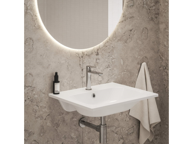 Nábytkové tenkostěnné umyvadlo Chrome Slim z litého mramoru k instalaci na zeď nebo k zapuštění do závěsné skříňky Chrome, s přepadem. Bílé provedení.