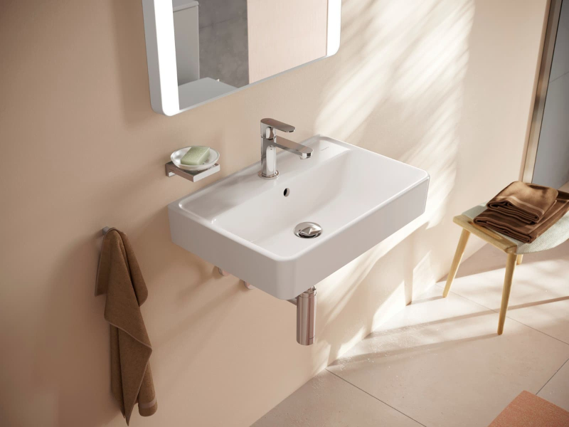 Umyvadlo v bílé barvě s otvorem pro baterii uprostřed od výrobce Hansgrohe ze série Xanuia Q. Rozměry produktu jsou 60x37x10,5 cm.