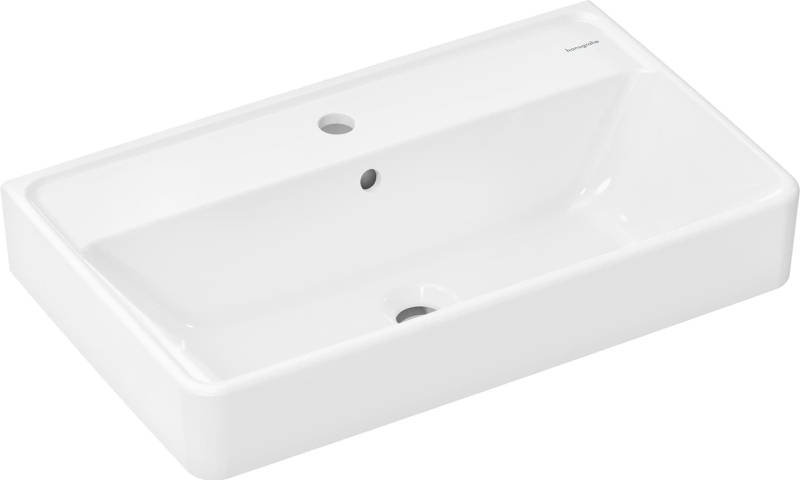 Umyvadlo v bílé barvě s otvorem pro baterii uprostřed od výrobce Hansgrohe ze série Xanuia Q. Rozměry produktu jsou 65x39x10,5 cm.