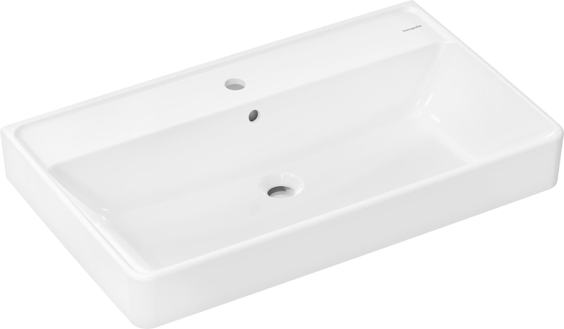 Umyvadlo v bílé barvě s otvorem pro baterii uprostřed od výrobce Hansgrohe ze série Xanuia Q. Rozměry produktu jsou 80x48x10,5 cm.