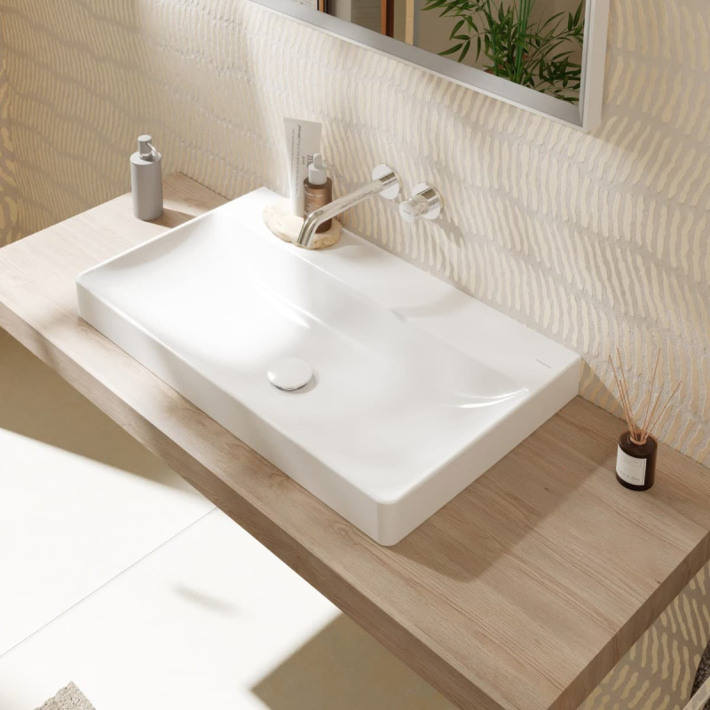 Umyvadlo v bílé barvě bez otvoru pro baterii, bez přepadu od výrobce Hansgrohe ze série Xelu Q. Rozměry produktu jsou 80x48x14 cm.
