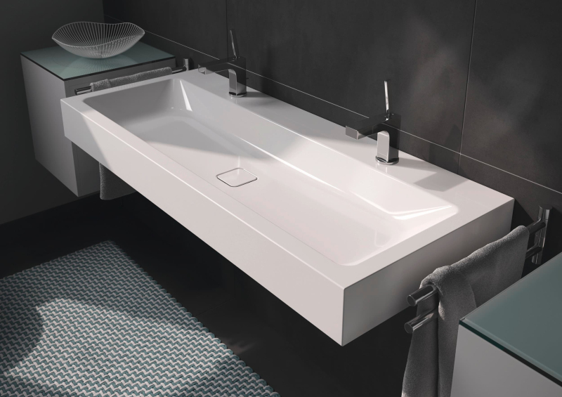 Umyvadlo se dvěma otvory pro baterii o šířce 120 cm, hloubce 50 cm a výšce 12 cm v alpské bílé. Povrch se snadnou údržbou. Balení bez sifonu a baterie.