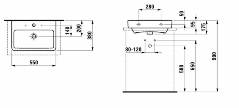 Umyvadlo bez otvoru pro baterii a přepadu o šířce 55 cm, hloubce 38 cm a výšce 17,5 cm. Balení bez sifonu a baterie. Montážní sadu je nutné dokoupit.