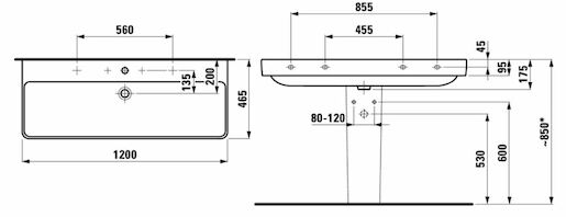 Umyvadlo s otvorem pro baterii uprostřed o šířce 120 cm, hloubce 46 cm a výšce 17,5 cm. Balení bez sifonu a baterie. Montážní sadu je nutné dokoupit.