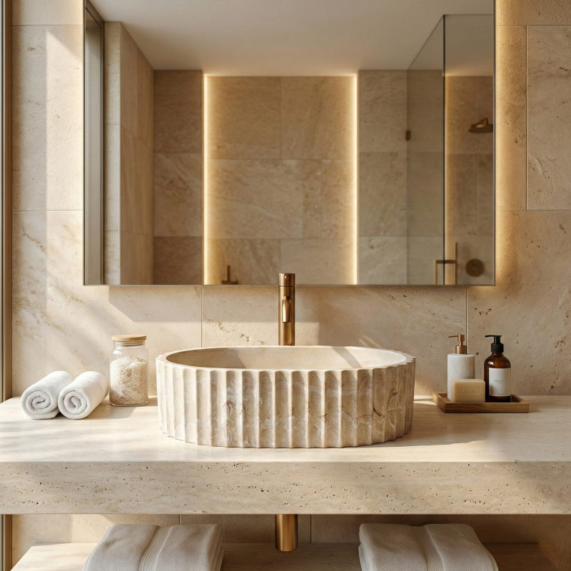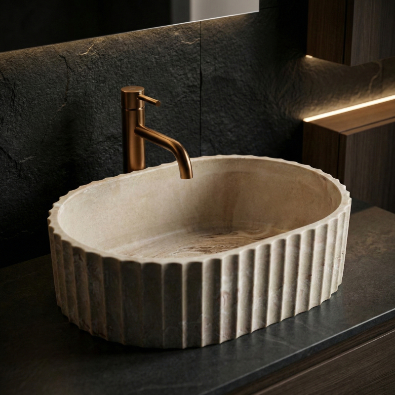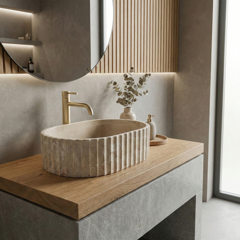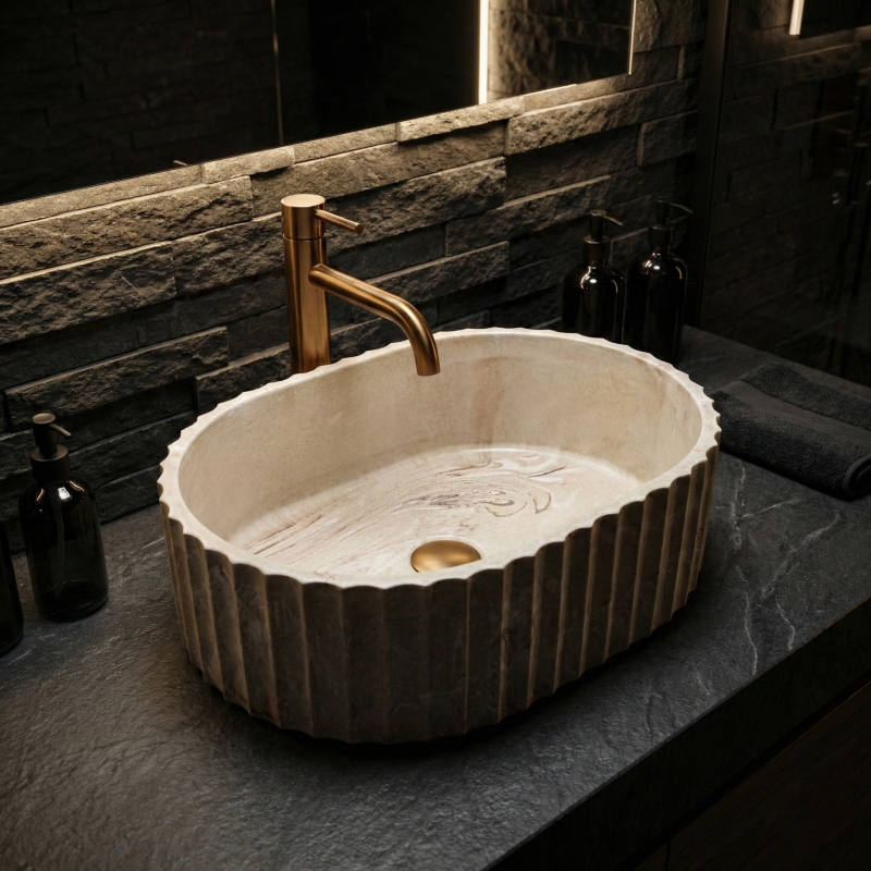 Dodejte své koupelně přirozenou eleganci s umyvadlem na desku Rea Margaret Gio. Tato varianta vyniká výrazným rýhovaným tělem a kamenitou barevností inspirovanou přírodou. Díky odolnému kompozitu Artificial Stone spojuje dekorativní design s vysokou praktičností pro každodenní používání. Ryflowaná struktura – vnější stěny zdobí pravidelné svislé rýhování, které dodává rytmus a sochařský charakter. Detail, který z umyvadla dělá dominantní prvek. Povrch Gio Stone – světlé pískově béžové tóny s přirozeným žilkováním vytvářejí dojem přírodního kamene a přinášejí do interiéru teplo a organický klid. Materiál Artificial Stone – moderní kamenný kompozit odolává poškrábání, skvrnám i běžnému opotřebení. Je příjemný na dotek a vzhledem blíže přírodnímu kameni než klasická keramika. Hladký vnitřek – v kontrastu k dekorativnímu tělu zůstává vnitřek hladký, což usnadňuje údržbu a podporuje volný odtok vody. Montáž na desku – určeno pro instalaci na desku nebo skříňku, aby vynikla rýhovaná forma. Rea Margaret Gio skvěle zapadne do koupelen ve stylu japandi, soft loft, modern organic i do moderních prémiových interiérů. Kamenitá paleta a výrazná textura přinášejí harmonii a promyšlený design.