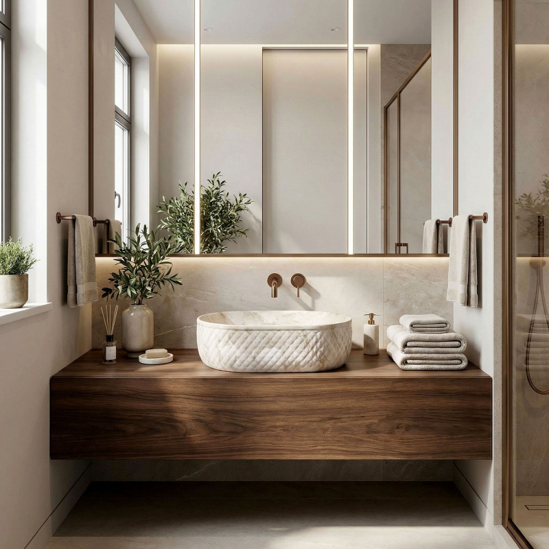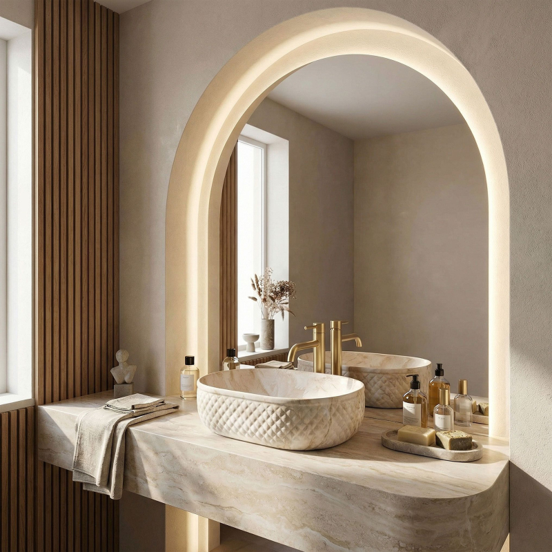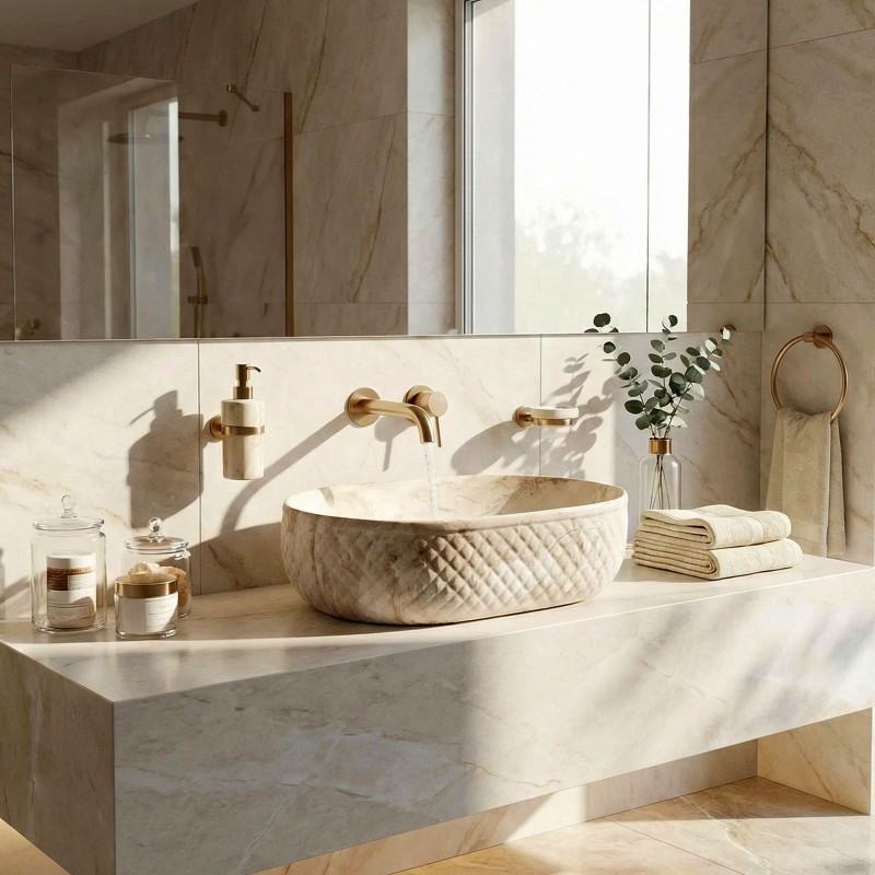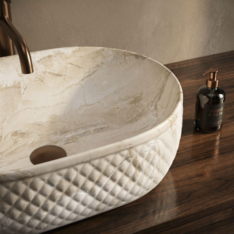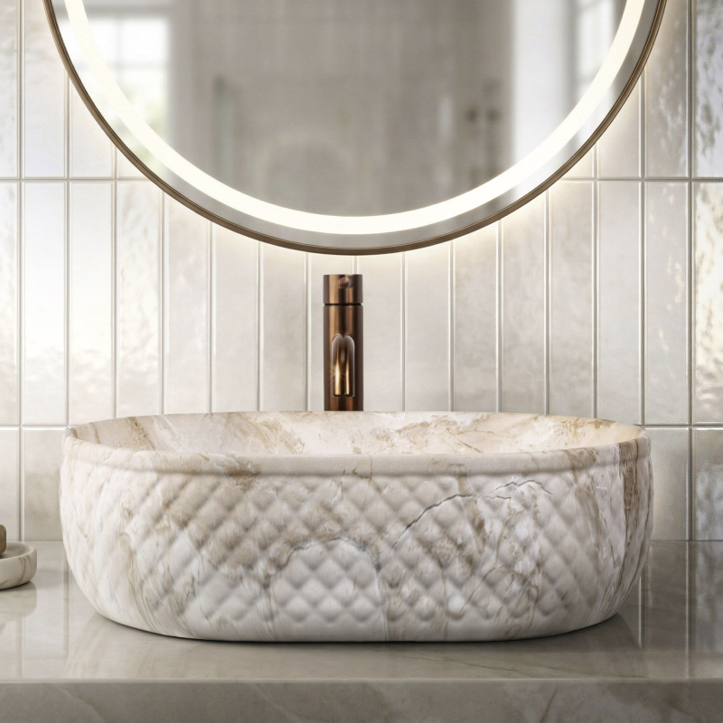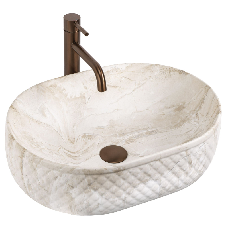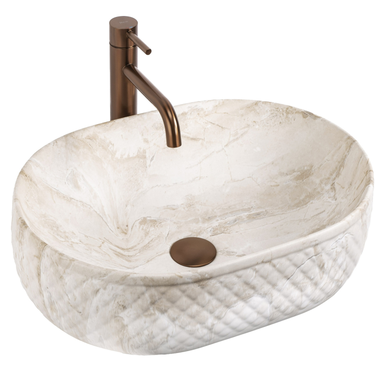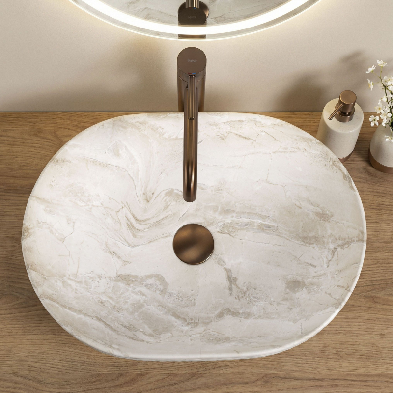 Objevte mimořádné spojení přírodní estetiky a moderní formy, které do vašeho interiéru vnese umyvadlo na desku Oktawia s unikátním vzorem imitujícím kámen. Tento model zaujme nejen svou oválnou linií, ale především fascinujícím kontrastem mezi hladkým vnitřkem a bohatě strukturovaným vnějším povrchem. Vyrobené z nejkvalitnější sanitární keramiky je symbolem trvanlivosti a vytříbeného stylu, který promění každou mycí zónu.Efektní vnější reliéf – charakteristická dekorativní struktura na vnější straně mísy dodává výrobku trojrozměrný efekt a činí z umyvadla hlavní dekorativní bod koupelny.Vzor imitující kámen – saténové provedení s motivem přírodního žilkování dokonale zapadá do trendů eko, loft i moderní klasiky a dodává interiéru ušlechtilý charakter bez náročné údržby pravého kamene.Hladký vnitřní povrch – zajišťuje rychlý odtok vody a usnadňuje udržení hygienické čistoty, přičemž minimalizuje usazování vodního kamene a nečistot.Univerzální oválný tvar – ergonomický tvar mísy zabraňuje rozstřikování vody na desku a poskytuje maximální komfort při každodenní hygieně. Volbou tohoto modelu umyvadla na desku Oktawia od REA investujete do produktu, který spojuje estetický a stylový vzhled s precizním zpracováním. Skvěle ladí s bateriemi ve zlaté, měděné nebo matně černé barvě a vytváří soudržnou a luxusní aranžaci. Je to ideální volba pro ty, kteří hledají neotřelá řešení spojující přírodní inspirace s nejvyšší funkčností.