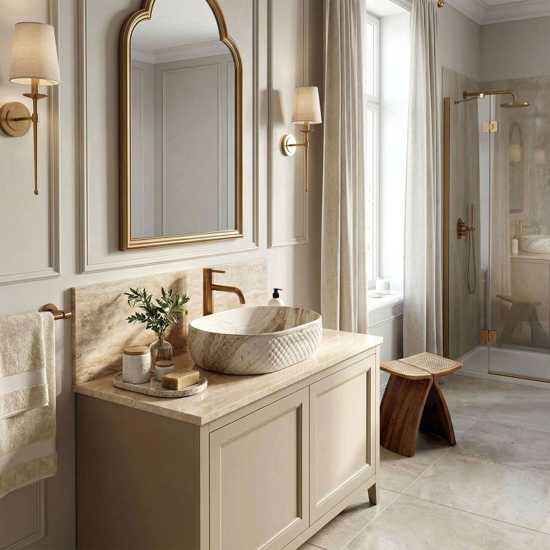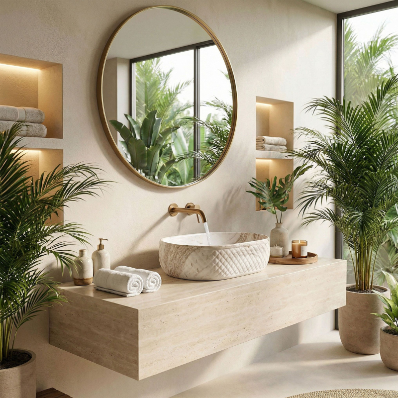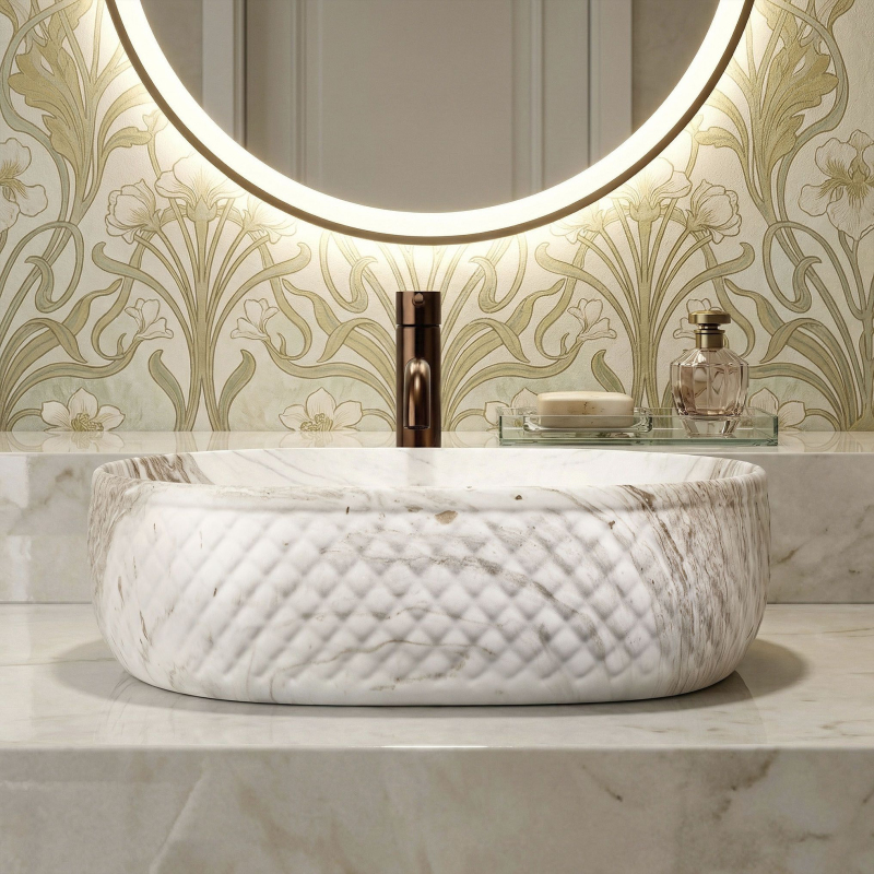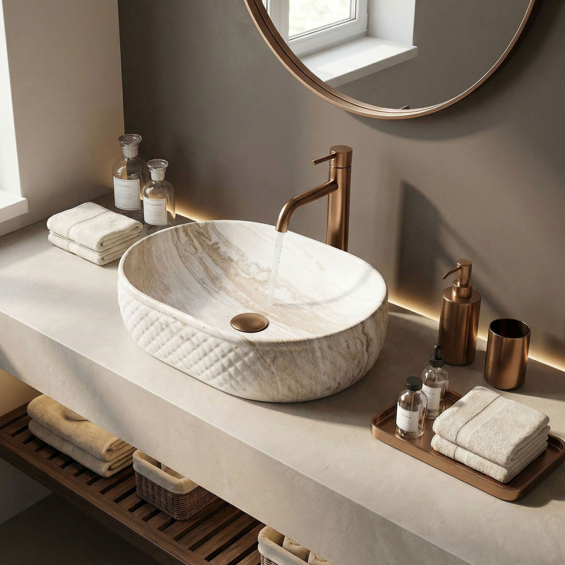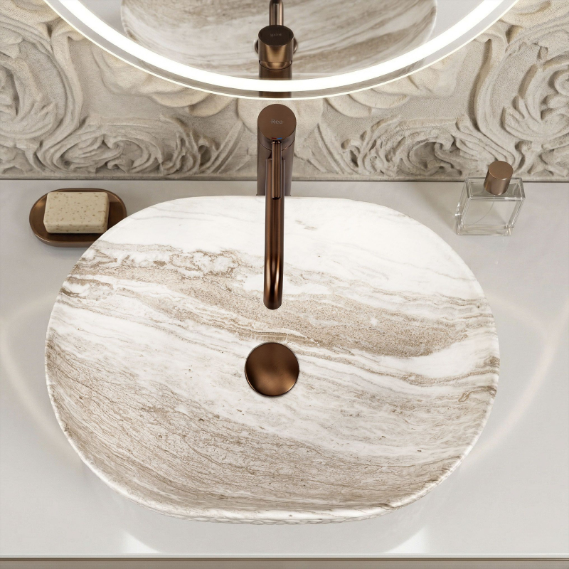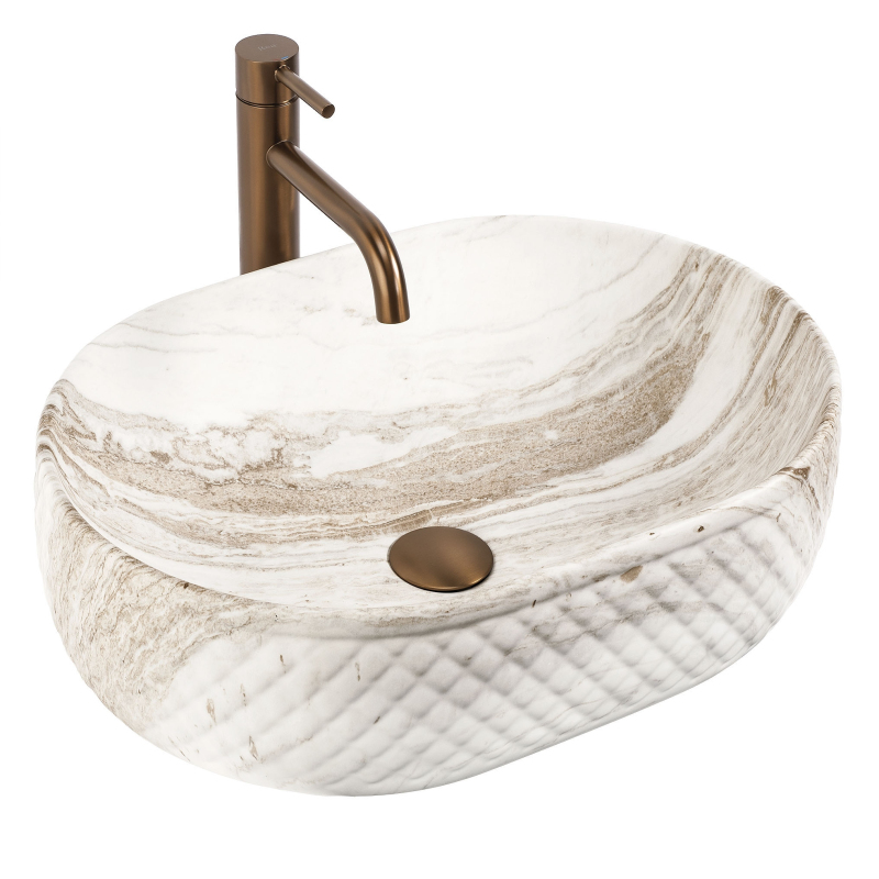 Objevte mimořádné spojení přírodní estetiky a moderní formy, které do vašeho interiéru vnese umyvadlo na desku Oktawia s unikátním vzorem imitujícím kámen. Tento model zaujme nejen svou oválnou linií, ale především fascinujícím kontrastem mezi hladkým vnitřkem a bohatě strukturovaným vnějším povrchem. Vyrobené z nejkvalitnější sanitární keramiky je symbolem trvanlivosti a vytříbeného stylu, který promění každou mycí zónu.Efektní vnější reliéf – charakteristická dekorativní struktura na vnější straně mísy dodává výrobku trojrozměrný efekt a činí z umyvadla hlavní dekorativní bod koupelny.Vzor imitující kámen – saténové provedení s motivem přírodního žilkování dokonale zapadá do trendů eko, loft i moderní klasiky a dodává interiéru ušlechtilý charakter bez náročné údržby pravého kamene.Hladký vnitřní povrch – zajišťuje rychlý odtok vody a usnadňuje udržení hygienické čistoty, přičemž minimalizuje usazování vodního kamene a nečistot.Univerzální oválný tvar – ergonomický tvar mísy zabraňuje rozstřikování vody na desku a poskytuje maximální komfort při každodenní hygieně. Volbou tohoto modelu umyvadla na desku Oktawia od REA investujete do produktu, který spojuje estetický a stylový vzhled s precizním zpracováním. Skvěle ladí s bateriemi ve zlaté, měděné nebo matně černé barvě a vytváří soudržnou a luxusní aranžaci. Je to ideální volba pro ty, kteří hledají neotřelá řešení spojující přírodní inspirace s nejvyšší funkčností.