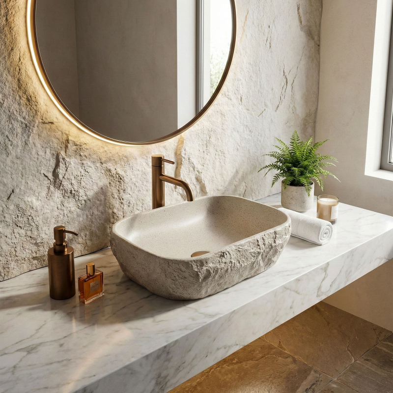 Objevte jedinečné spojení přírody a moderního stylu ve své koupelně díky umyvadlu na desku Rea Bianka v provedení světlá béžová. Tato výjimečná volba je určena pro ty, kteří chtějí do interiéru vnést nádech luxusu a originálního stylu.Naše umyvadla na desku nabízejí řadu výhod:Vnější struktura kamene – dodává koupelně prestižní vzhled.Hladký vnitřní povrch – umožňuje rychlé čištění.Saténová povrchová úprava – přidává eleganci.Unikátní barevnost – světle béžový odstín s tmavšími detaily maskuje drobné usazeniny.Optimální střední velikost – ideální pro každodenní používání.Umyvadlo Rea Bianka spojuje komfort s moderním designem.