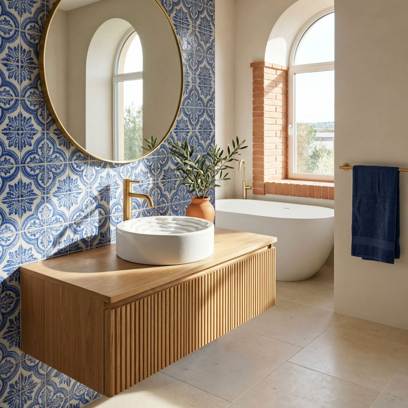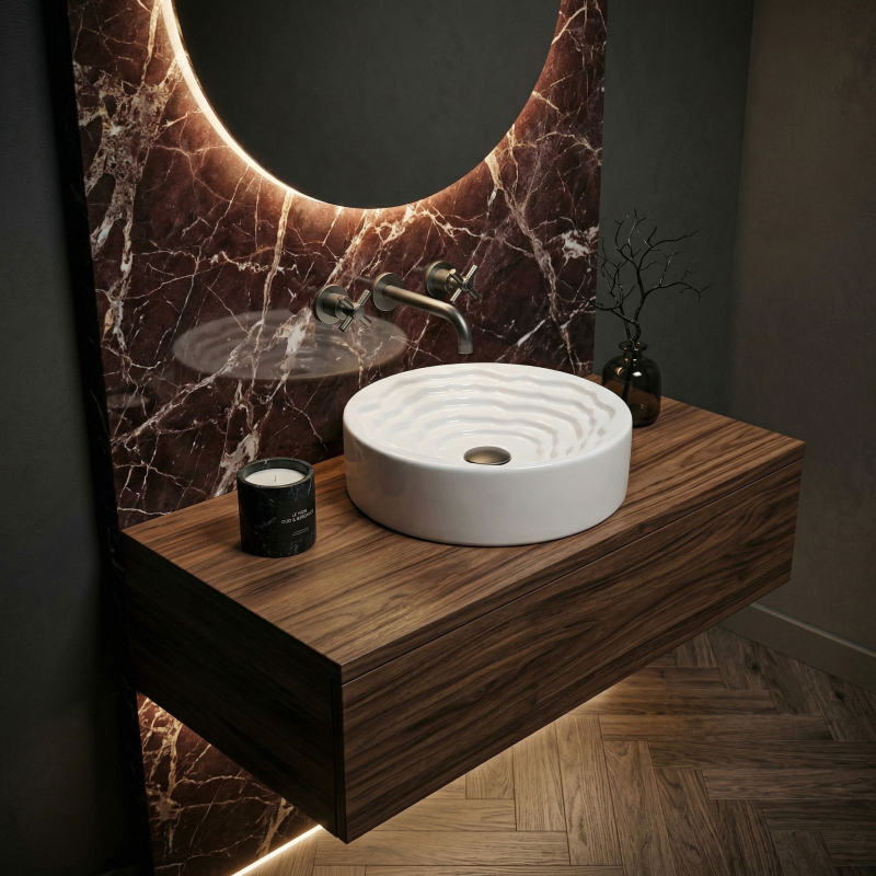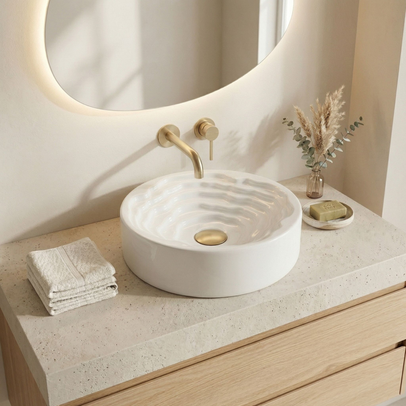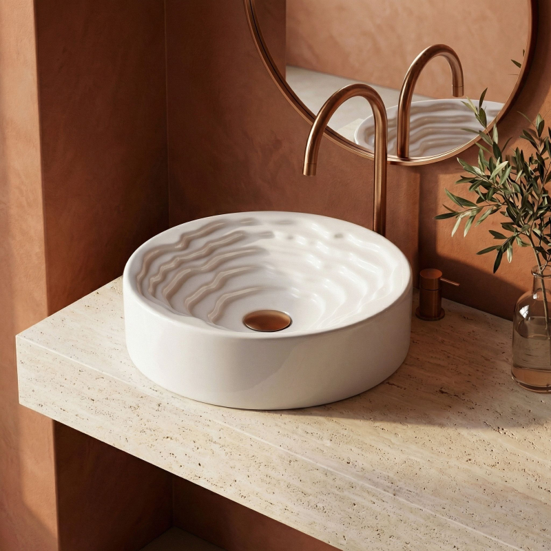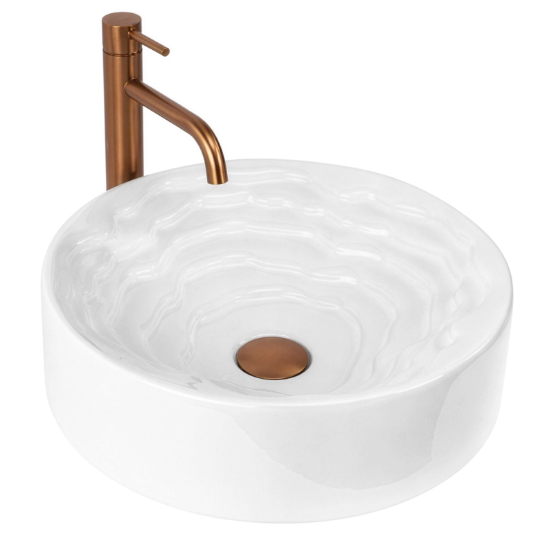 Objevte nový rozměr designu ve své koupelně s kulatým umyvadlem na desku Rea Calla. Tento keramický model kombinuje minimalistický vnější tvar s překvapivým uměleckým vnitřkem mísy a stává se skutečnou ozdobou každé koupelny.Unikátní vnitřek mísy – střed umyvadla zaujme trojrozměrnou kaskádovitou a stupňovitou strukturou s nepravidelnými liniemi. Tento prostorový vlnitý vzor dodává celému tělesu výrazný sochařský charakter.Hladký vnější povrch – v elegantním kontrastu s bohatě zdobeným vnitřkem si vnější část mísy zachovává dokonale hladký, klasický válcový tvar, který do formy vnáší dávku harmonie a klidu.Lesklá sanitární keramika – výroba z nejkvalitnější bílé keramiky zaručuje odolnost proti poškrábání a změně barvy. Lesklá, sněhobílá glazura krásně odráží světlo, čímž ještě více zdůrazňuje trojrozměrnost vnitřního tvarování.Pohodlí při používání – i přes vyřezávanou strukturu usnadňují vhodně profilované, jemné linie vln a dokonale hladká glazura odtok vody a zajišťují, že údržba umyvadla v čistotě je rychlá a bezproblémová.Montáž na desku – umyvadlo je přizpůsobeno k instalaci na desku nebo koupelnovou skříňku, díky čemuž se stává centrálním, poutavým bodem mycí zóny.Keramické umyvadlo Calla je ideální volbou pro lidi hledající netradiční řešení do interiérů v moderním, avantgardním nebo glamour stylu.