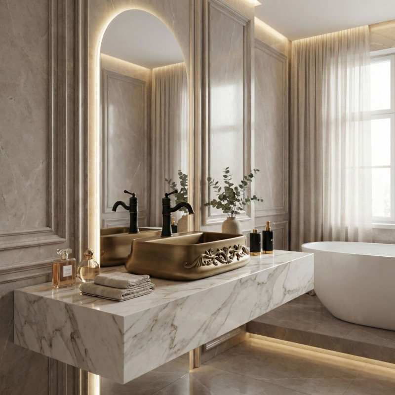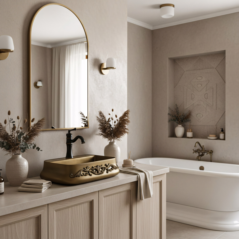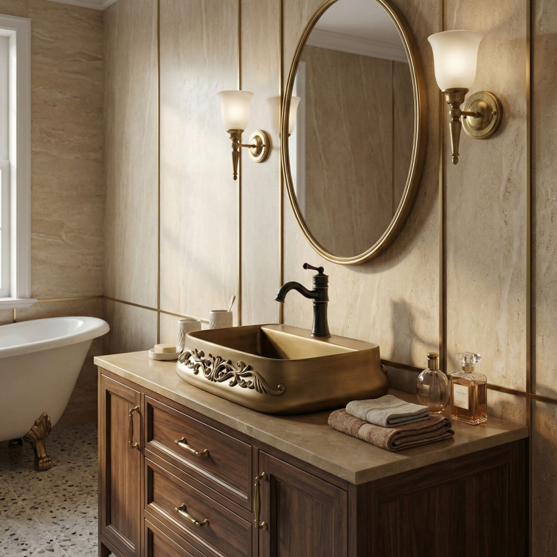 Zvol keramické umyvadlo na desku Rea Castel, pokud hledáš výrazný, klasický akcent do své koupelny. Tento model je skvělou volbou pro milovníky retro, vintage a rustikálního stylu – spojuje funkční tvar s mimořádně efektním, bohatým zdobením.Výjimečné zdobení (reliéf) – čelo umyvadla zdobí vystouplý florální ornament. Je to detail, který okamžitě upoutá pozornost a stane se hlavním dekorativním prvkem, dodávajícím elegantní, řemeslný charakter.Povrch v odstínu staré mosazi – keramický povrch získal jedinečnou barvu patinované hnědi. Tento záměrný vizuální efekt skvěle podtrhuje vintage styl a dodává celé formě ušlechtilost.Polička s otvorem pro baterii – model Castel má integrovanou poličku s továrně připraveným otvorem. Umožňuje pohodlnou montáž stojánkové baterie přímo na umyvadlo, chrání desku před cákanci a usnadňuje každodenní úklid.Odolná sanitární keramika – umyvadlo je vyrobeno z klasické, pevné keramiky. Zaručuje snadnou údržbu, hladký vnitřní povrch a odolnost proti změně barvy.Montáž na desku – instalace přímo na skříňku nebo desku umožní plně vyniknout zdobenému plášti i plynule tvarovaným hranám umyvadla.Umyvadlo Rea Castel je výrazný detail, který dokáže zcela změnit charakter interiéru. Jeho bohatá ornamentika a teplá barevnost se skvěle hodí do koupelen v klasickém, „zámeckém“ či eklektickém stylu a vytváří soudržný a stylový prostor.