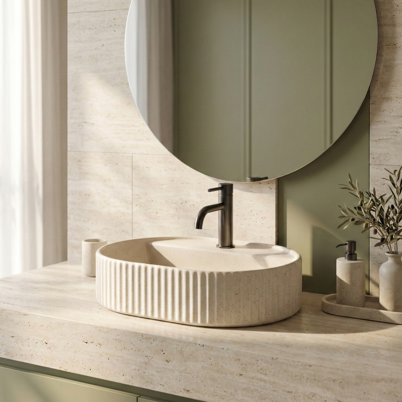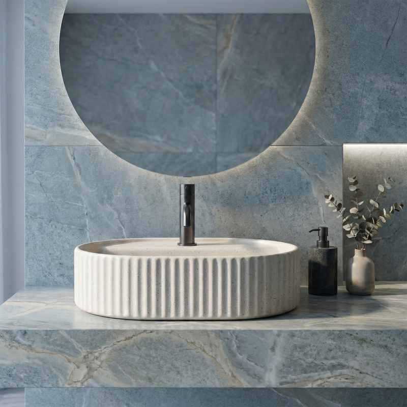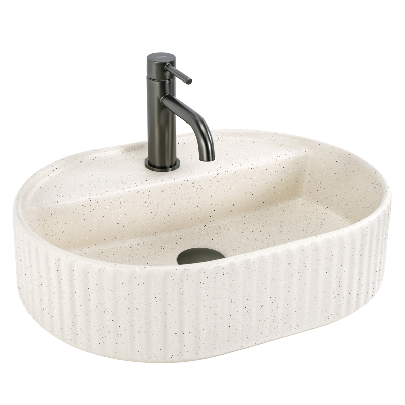 Umyvadlo na desku Rea Marcela 50 ve variantě Vanilla je ideální volbou do koupelen, kde záleží na propracovaném detailu a klidné, elegantní barevnosti. Teplý odstín lomené bílé prostor opticky odlehčí a přináší „jemný“ dojem čistoty, zároveň se skvěle kombinuje s kamennými deskami, dřevem i černými či grafitovými bateriemi. Díky tomu se hodí jak do moderních prémiových interiérů, tak do stylu soft loft nebo modern classic.Tvar zaujme výrazným svislým žebrováním na vnější stěně, které podtrhuje designový charakter a dělá z umyvadla dekorativní prvek. Další výhodou je decentní tečkovaná struktura viditelná na povrchu – dodává povrchu hloubku, přirozený „kamenný“ efekt a celkově velmi noblesní vzhled. Oválná, pohodlně tvarovaná mísa zajišťuje komfort při každodenním používání a matná povrchová úprava Vanilla pomáhá udržet jednotný, moderní vzhled umyvadlové zóny.
