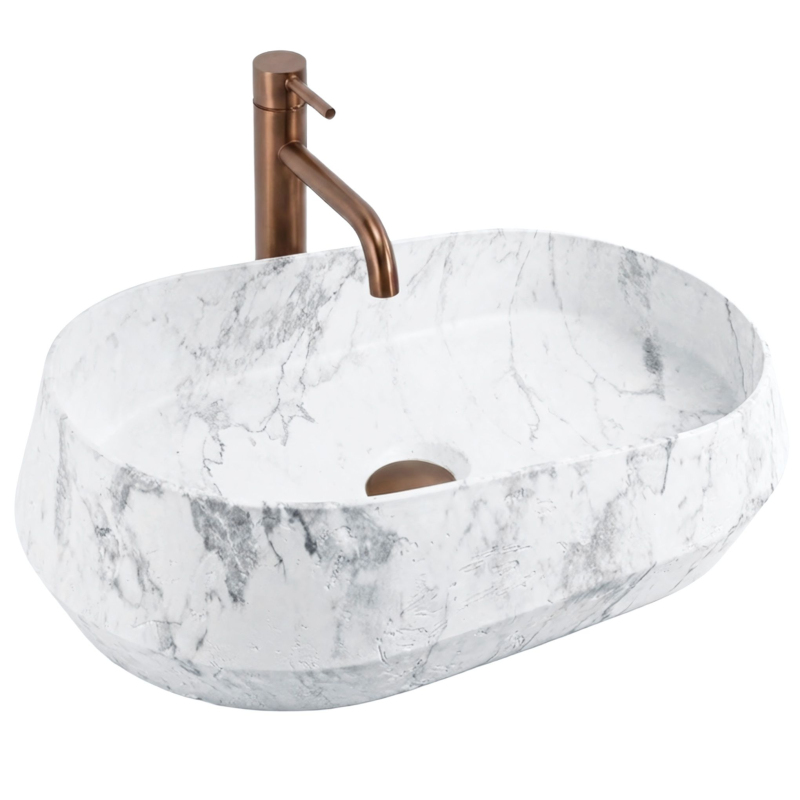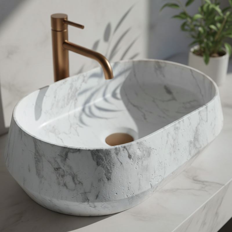 Umyvadlo na desku Zoe Dune je model, který na první pohled upoutá pozornost. Místo klasické dokonale rovné mísy nabízí tvar inspirovaný přírodou a surovým kamenem. Je to skvělá volba, pokud hledáte výrazný, ale nepřehnaný akcent do koupelny.Umělý kámen (Artificial Stone) – umyvadlo je vyrobeno z vysoce kvalitního kompozitu. Tento materiál se vyznačuje masivností, mimořádnou odolností a vysokou rezistencí vůči mechanickému poškození. Navíc je příjemný na dotek a déle udržuje teplotu vody.Asymetrický tvar – to, co model Zoe Dune nejvíce odlišuje, je jeho nepravidelná forma. Jeden okraj mísy je zřetelně vyšší než druhý. Tento designový prvek dodává umyvadlu dynamický, organický vzhled.Vzor přírodního kamene – povrch má matnou úpravu s výrazným šedo-grafitovým žilkováním. Matná textura umocňuje surový efekt přírodního materiálu a zároveň je velmi praktická při každodenním používání.Montáž na desku – umyvadlo je určeno k instalaci přímo na skříňku nebo desku. Tento způsob montáže umožňuje plně vyniknout jeho netradičnímu tvaru a usnadňuje uspořádání prostoru kolem.Pohodlný vnitřek – navzdory nepravidelnému vnějšímu tvaru je vnitřek mísy hladký a správně tvarovaný. Voda volně stéká do odpadu, což omezuje rozstřikování při mytí rukou.Umyvadlo Zoe Dune představuje výrazný přírodní akcent v interiéru. Jeho asymetrická linie a kamenná struktura se ideálně hodí do moderních, minimalistických koupelen i interiérů ve stylu wabi-sabi.