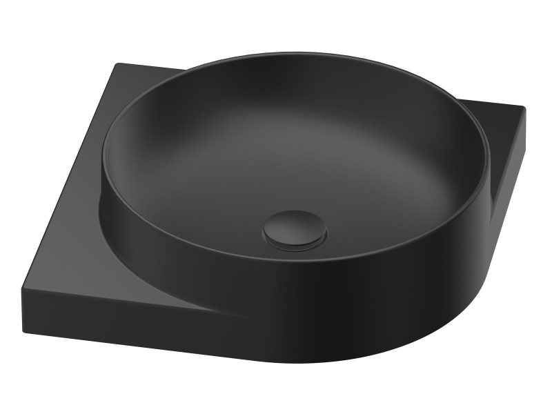 Tenkostěnné keramické rohové umyvadlo Yard k instalaci na konzoli Yard, bez přepadu. V černém matném provedení. Bez otvoru - pro kombinaci s umyvadlovou podomítkovou baterií.