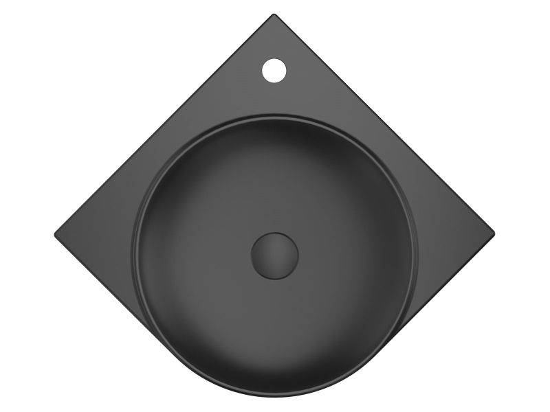 Tenkostěnné keramické rohové umyvadlo Yard k instalaci na konzoli Yard, bez přepadu. V černém matném provedení. S otvorem pro stojánkovou baterii.
