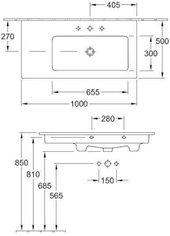 Umyvadlo o šířce 100 cm, hloubce 50 cm. Balení bez sifonu a baterie.