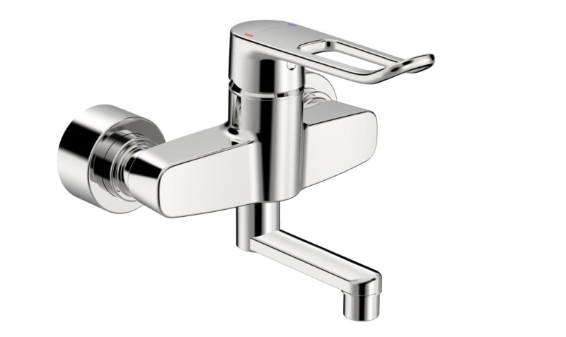 Páková nástěnná umyvadlová baterie s otočným ramínkem. V chromovém provedení. Rozteč baterie 150 mm.