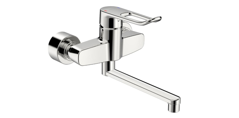 Páková nástěnná umyvadlová baterie s otočným ramínkem. V chromovém provedení. Rozteč baterie 150 mm.