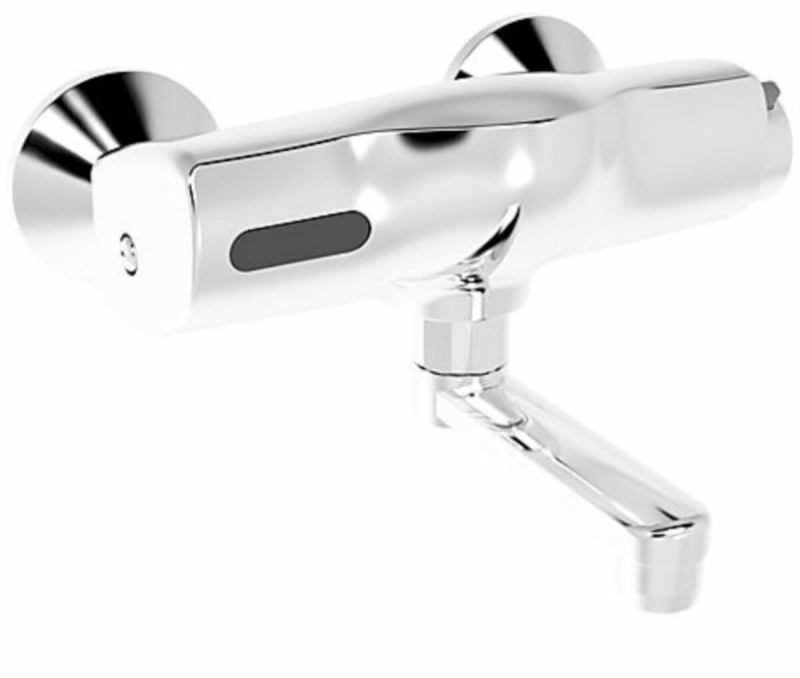 Čelní nástěnná umyvadlová baterie se senzorem. V chromovém provedení. Průtok baterie je 6 litrů/minutu. Rozteč baterie 150 mm.