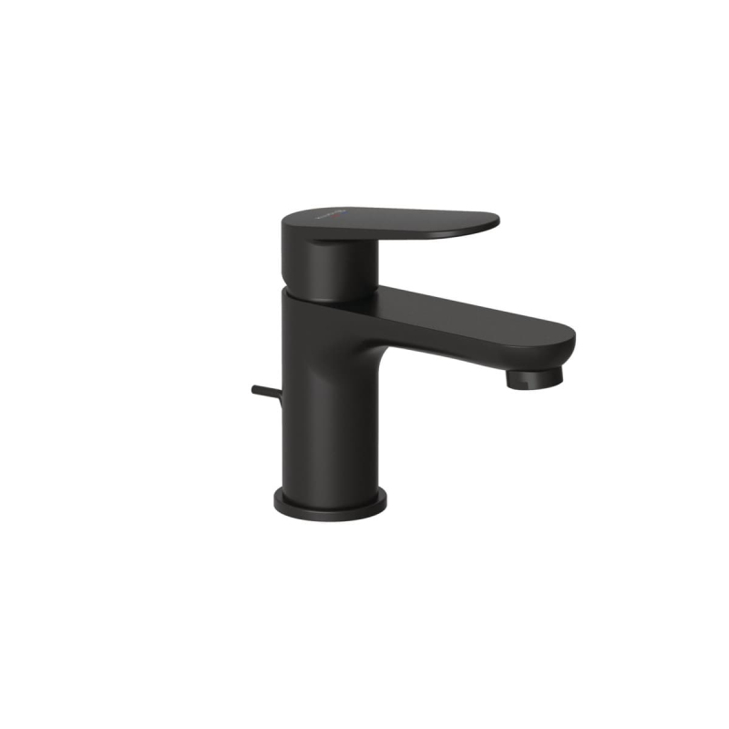 Páková stojánková umyvadlová baterie s výpustí v černém matném provedení. Průtok baterie je 4,5 litrů/minutu. Výška baterie je 14,5 cm. Ramínko je ve výšce 7,5 cm. S matným povrchem