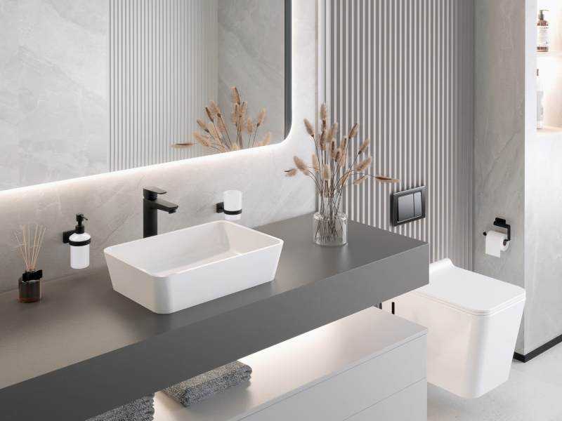 Páková stojánková umyvadlová baterie bez výpusti. V černé barvě. S matným povrchem.