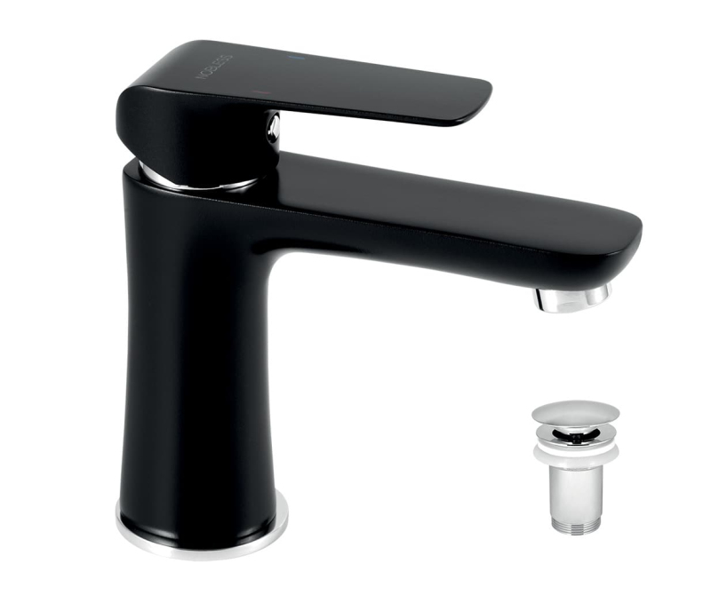 Páková stojánková umyvadlová baterie s click-clack výpustí. V provedení černá a chrom.