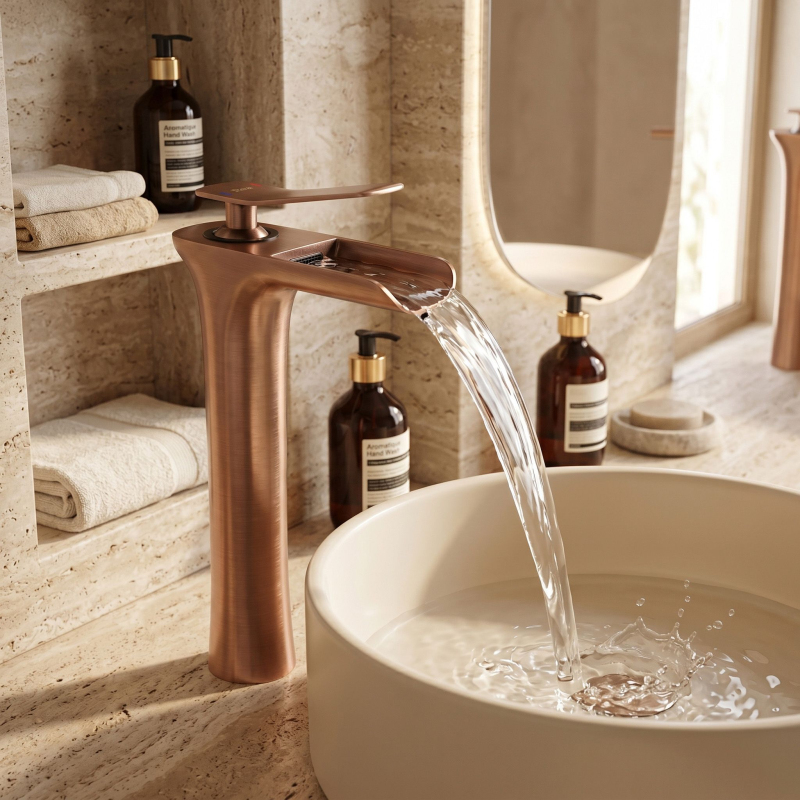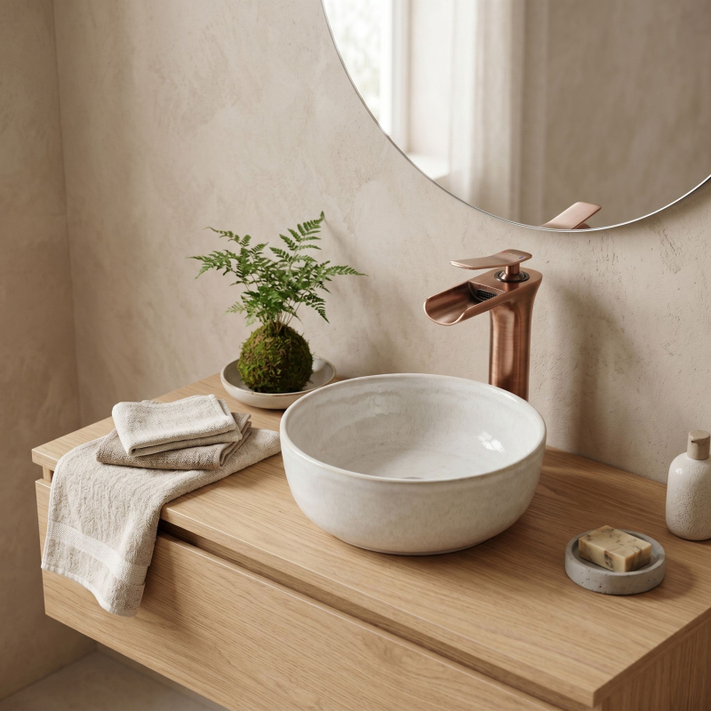 Umyvadlová baterie Rea Laguna v provedení Kartáčovaná měď (Brushed Copper) je skutečnou ódou na přírodu zachycenou v moderní technologické formě. Jejím nejcharakterističtějším prvkem je otevřený kaskádový výtok, který mění běžný proud vody v uklidňující pohled na miniaturní vodopád. Vysoké tělo činí z tohoto modelu ideálního partnera pro elegantní umyvadla na desku.Kaskádový výtok vody – široká žlábková konstrukce výtoku umožňuje kochat se pohledem na tekoucí vodu, což dodává každodenní hygieně relaxační charakter.Výjimečná barva Kartáčovaná měď – teplý, hluboký odstín mědi s výraznou kartáčovanou strukturou vnáší do koupelny ušlechtilost a útulnost.Vysoká konstrukce na desku – díky optimální výšce baterie Laguna dokonale spolupracuje s mísami umyvadel umístěných na desce.Inovativní PVD povlak – barva nanášená vakuovou metodou zaručuje nejvyšší odolnost proti poškrábání a korozi.Keramická kartuše – vnitřek baterie ukrývá kvalitní keramický ventil pro plynulou regulaci teploty a proudu vody.Ergonomická rukojeť – mírně zvednutá páka umožňuje intuitivní ovládání a designově ladí s linií výtoku.Mosazné provedení – masivní tělo z husté mosazi zajišťuje stabilitu a odolnost proti změnám tlaku.