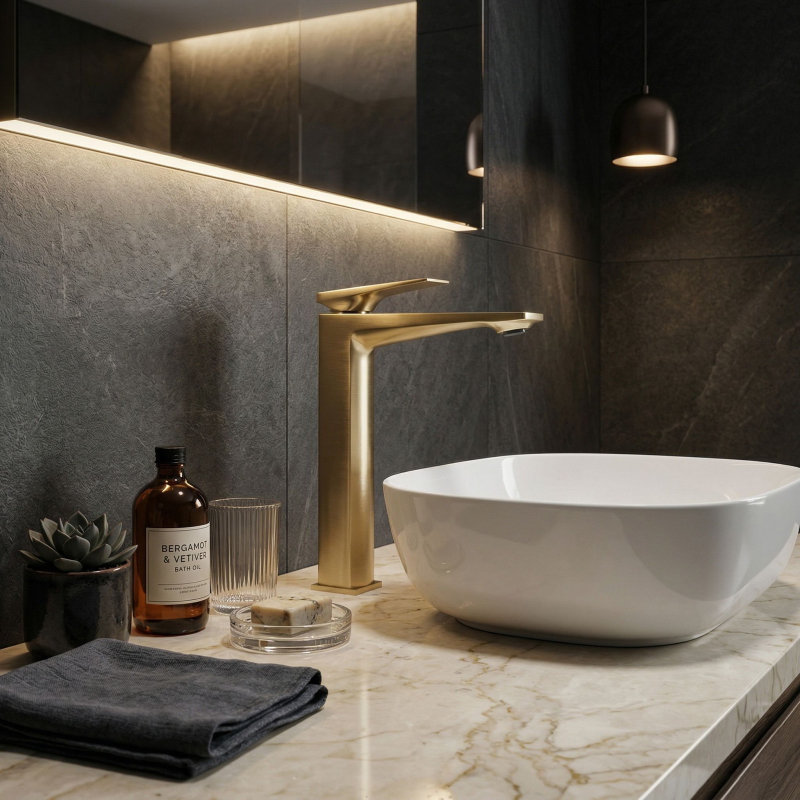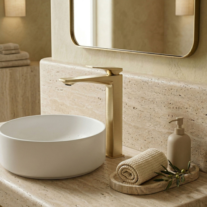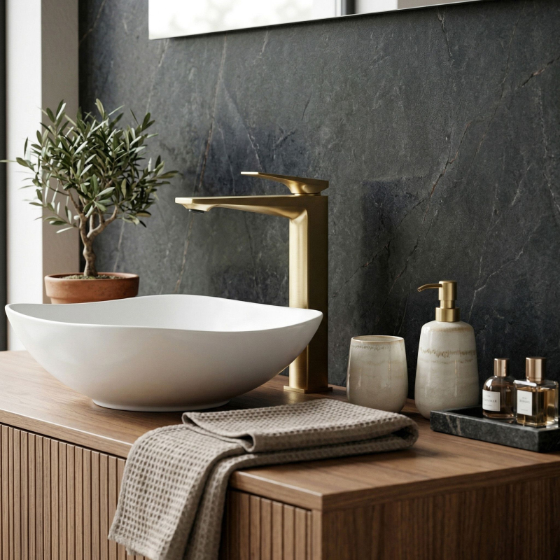 Vysoká umyvadlová baterie Prime v barvě broušeného zlata je elegantní volbou do moderních a luxusních umyvadlových zón. Štíhlý, vysoký tvar a geometrická, výrazná linie jí dodávají osobitý charakter, zatímco ušlechtilé provedení v odstínu broušeného zlata vnáší do interiéru teplo a vytříbený styl.Vysoká konstrukce pro umyvadla na desku – baterie byla navržena s ohledem na umyvadla na desku, zajišťuje pohodlný prostor pro každodenní používání a zároveň jednotný, elegantní vzhled celé mycí zóny.Povrch v broušeném zlatě – působivý teplý odstín s jemně broušenou strukturou krásně podtrhuje moderní design baterie a skvěle se kombinuje se světlou keramikou, kamenem, dřevem i tmavšími, luxusními interiérovými akcenty.PVD povrchová úprava – moderní technologie nanášení povlaku zvyšuje odolnost povrchu proti oděru, poškrábání a každodennímu používání a zároveň pomáhá déle zachovat hloubku barvy i elegantní vzhled armatury.Robustní tělo – odolná mosazná konstrukce zajišťuje stabilitu, odolnost proti korozi a estetický vzhled po dlouhou dobu.Keramická kartuše – zodpovídá za plynulou a přesnou regulaci teploty a proudu vody, což se promítá do komfortu a spolehlivého fungování armatury.Moderní, geometrický design – harmonicky vedený tvar s výraznými hranami a plochou pákou dodává baterii decentní designový charakter, ideální pro elegantní prémiové koupelny. Volbou vysoké umyvadlové baterie Prime Broušené Zlato získáte spojení stylu, funkčnosti a nadčasové elegance. Jde o výjimečný prvek vybavení, který dokonale podtrhne charakter umyvadla na desku a dodá celé aranžaci luxusní završení.
