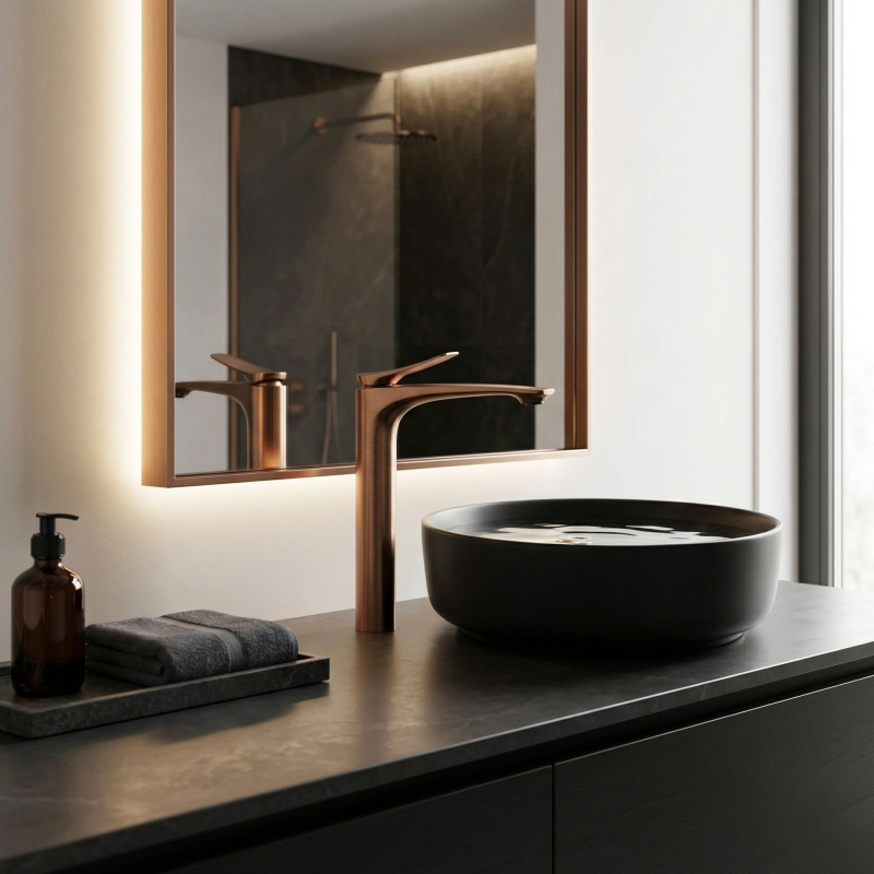 Vysoká umyvadlová baterie Vision v barvě broušené mědi je elegantní volbou do moderních a luxusních umyvadlových zón. Štíhlý, vysoký tvar a jemně profilovaná linie výtoku jí dodávají lehkost, zatímco ušlechtilé provedení v odstínu broušené mědi vnáší do interiéru teplo a vytříbený charakter.Vysoká konstrukce pro umyvadla na desku – baterie byla navržena s ohledem na umyvadla na desku, zajišťuje pohodlný prostor pro každodenní používání a zároveň jednotný, elegantní vzhled celé mycí zóny.Povrch v barvě broušené mědi – působivý teplý odstín s jemně broušenou strukturou krásně podtrhuje moderní design baterie a skvěle se kombinuje se světlým kamenem, keramikou, dřevem i tmavšími, luxusními interiérovými akcenty.PVD povrchová úprava – moderní technologie nanášení povlaku zvyšuje odolnost povrchu proti oděru, poškrábání a každodennímu používání a zároveň pomáhá déle zachovat hloubku barvy i elegantní vzhled armatury.Robustní tělo – odolná konstrukce zajišťuje stabilitu, odolnost při každodenním používání a estetický vzhled po dlouhou dobu.Keramická kartuše – zodpovídá za plynulou a přesnou regulaci teploty a proudu vody, což se promítá do komfortu a spolehlivého fungování armatury.Štíhlý, moderní design – harmonicky vedený tvar a jemně zvednutá páka dodávají baterii decentní designový charakter, ideální pro elegantní prémiové koupelny.Volbou vysoké umyvadlové baterie Vision Broušená Měď získáte spojení stylu, funkčnosti a nadčasové elegance. Jde o výjimečný prvek vybavení, který dokonale podtrhne charakter umyvadla na desku a dodá celé aranžaci luxusní završení.
