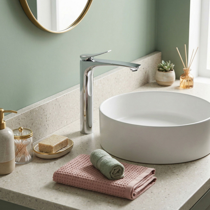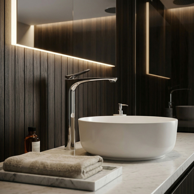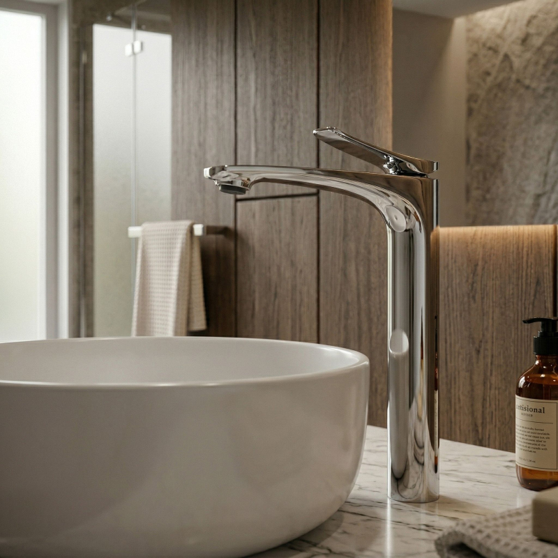 Vysoká umyvadlová baterie Vision v barvě chrom je elegantní volbou do moderních a luxusních koupelen. Štíhlý, vysoký tvar a jemně profilovaná linie výtoku jí dodávají lehkost, zatímco nadčasové chromované provedení krásně podtrhuje čistotu formy a vnáší do interiéru svěží, moderní charakter.Vysoká konstrukce pro umyvadla na desku – baterie byla navržena s ohledem na umyvadla na desku, zajišťuje pohodlný prostor pro každodenní používání a zároveň jednotný, elegantní vzhled celé mycí zóny.Chromované provedení – lesklý, hladký povrch dodává armatuře nadčasový vzhled a skvěle se kombinuje jak se světlou keramikou a kamenem, tak s moderními koupelnovými aranžmá.Electroplating povrchová úprava – použitá technologie galvanického pokovení povrchu zvyšuje odolnost armatury proti každodennímu používání, podporuje trvanlivost povrchové úpravy a pomáhá déle zachovat estetický lesk a elegantní vzhled baterie.Robustní tělo – odolná konstrukce zajišťuje stabilitu, odolnost při každodenním používání a estetický vzhled po dlouhou dobu.Keramická kartuše – zodpovídá za plynulou a přesnou regulaci teploty a proudu vody, což se promítá do komfortu a spolehlivého fungování armatury.Štíhlý, moderní design – harmonicky vedený tvar a jemně zvednutá páka dodávají baterii decentní designový charakter, ideální pro elegantní prémiové koupelny.Volbou vysoké umyvadlové baterie Vision Chrom získáte spojení stylu, funkčnosti a nadčasové elegance. Jde o výjimečný prvek vybavení, který dokonale podtrhne charakter umyvadla na desku a dodá celé aranžaci moderní, luxusní završení.
