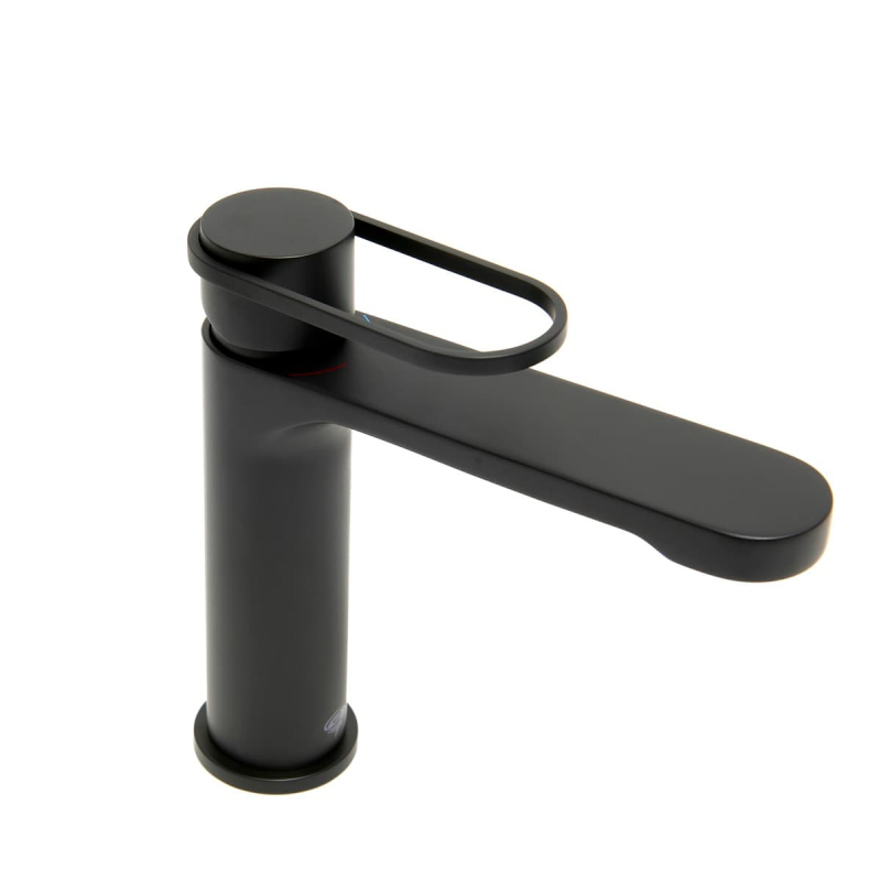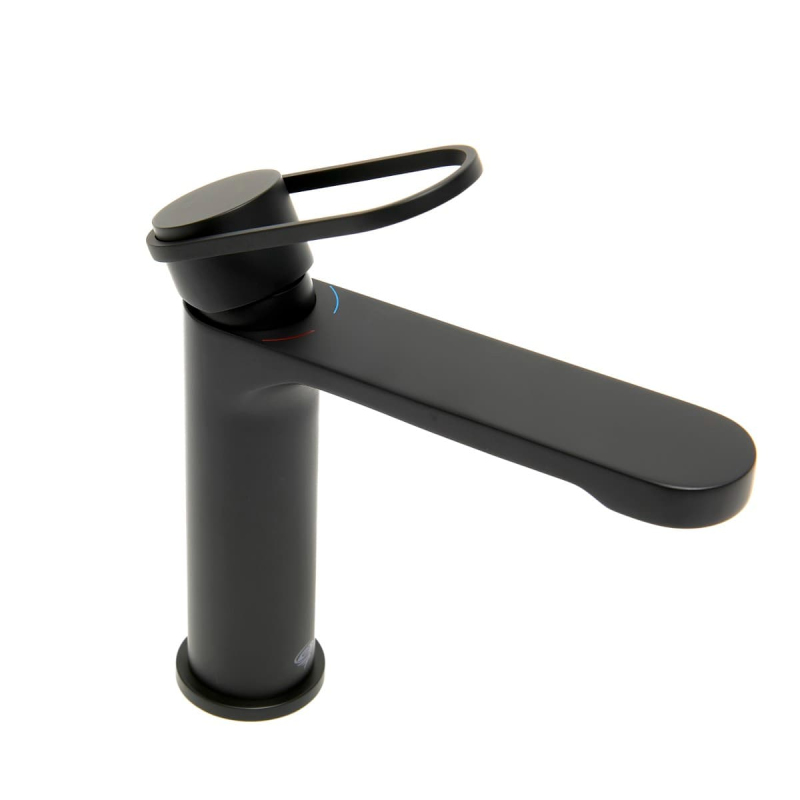 Páková stojánková umyvadlová baterie bez výpusti v černém matném provedení. Průtok baterie je 4,5 litrů/minutu. Výška baterie je 16 cm. Ramínko je ve výšce 11,8 cm. S matným povrchem.