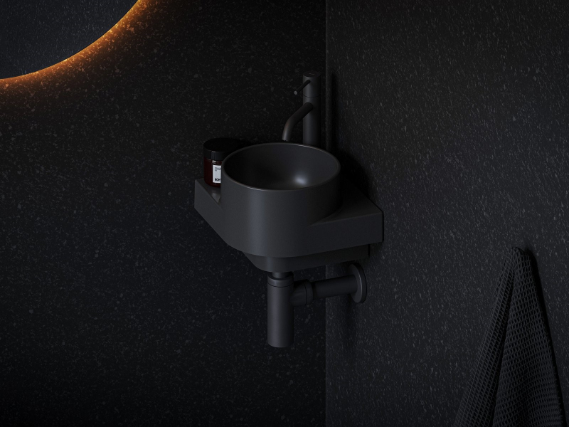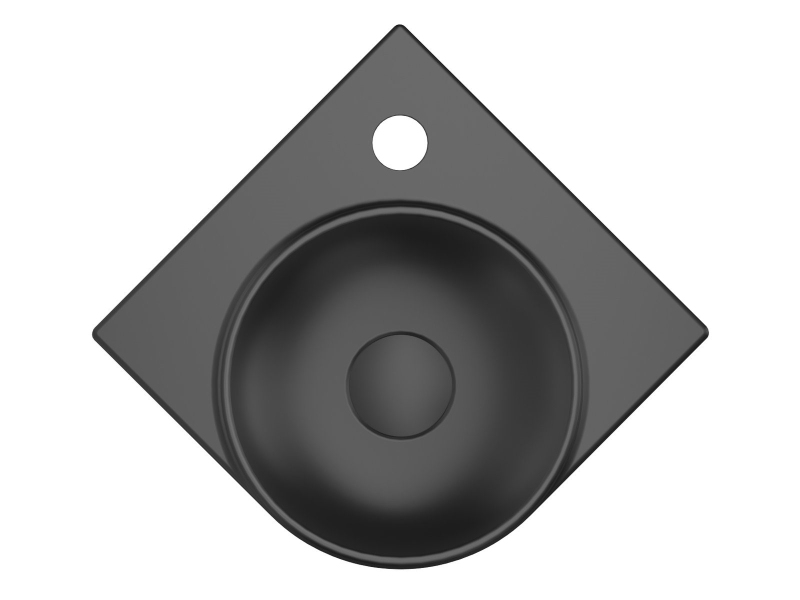Tenkostěnné keramické rohové umývátko Yard k instalaci na konzoli Yard, bez přepadu. V černém matném provedení. S otvorem pro stojánkovou baterii.