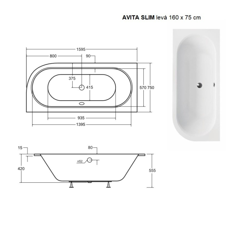 BESCO vana AVITA SLIM 160 (1600x750 mm), levé provedení, bez nožiček VANAVIT160SLIML