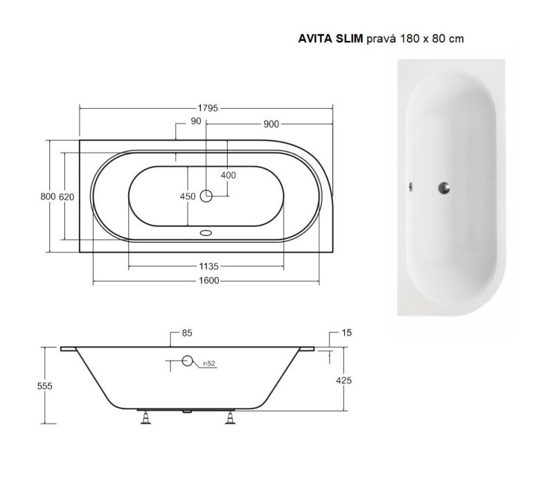 BESCO vana AVITA SLIM 180 (1800x800 mm), pravé provedení, bez nožiček VANAVIT180SLIMP
