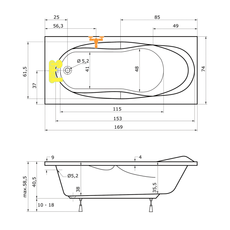 Obdélníková akrylátová vana CANARIA má nadčasový design s vytvarovanými opěrnými místy pro ruce a hlavu.