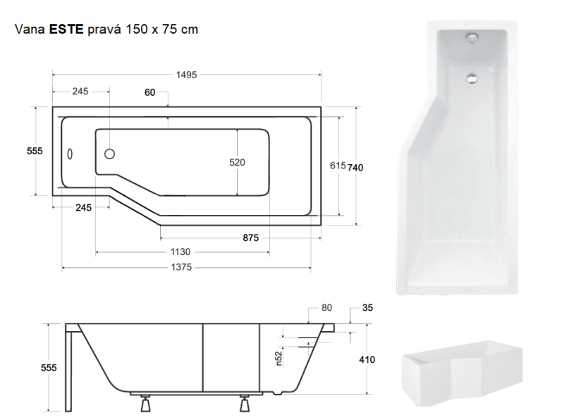 vana ESTE 150x74 cm, pravá VANEST15P