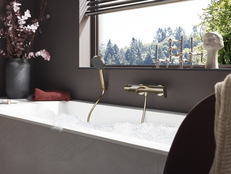 Páková nástěnná vanová baterie bez sprchového setu. V barevném provedení kartáčovaný bronz. Průtok baterie je 19,4 litrů/minutu. Rozteč baterie 150 mm. S matným povrchem