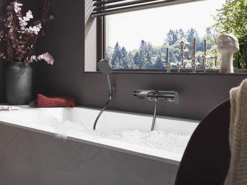 Páková nástěnná vanová baterie bez sprchového setu. V barevném provedení černý chrom. Průtok baterie je 19,4 litrů/minutu. Rozteč baterie 150 mm. S matným povrchem