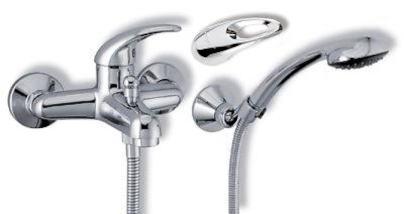 Páková nástěnná vanová baterie se sprchovým setem. V oblém designu. V chromovém provedení. Rozteč baterie 150 mm.