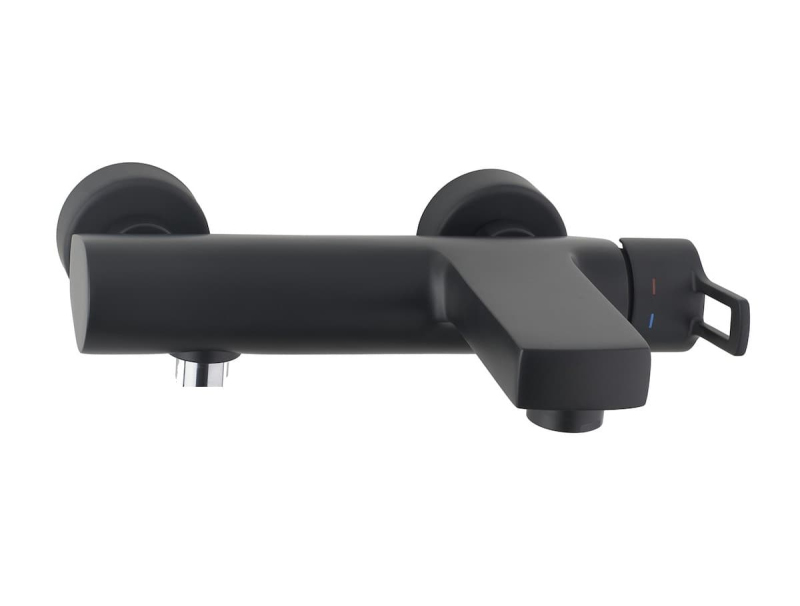 Páková nástěnná vanová baterie bez sprchového setu. V hranatém designu. V černé barvě. Rozteč baterie 150 mm. S matným povrchem.