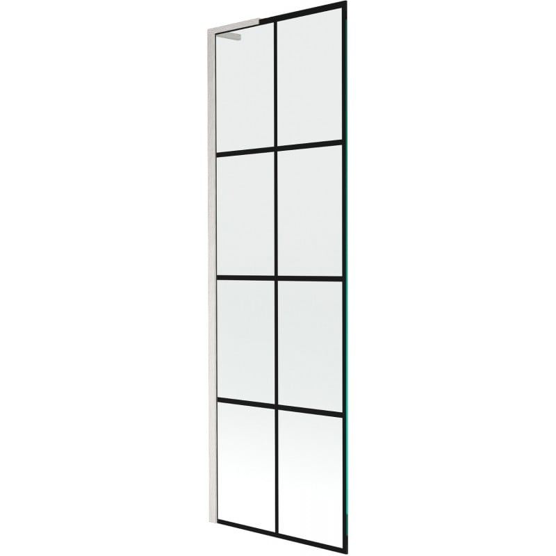 Technické údaje: Šířka: 60 cm Výška: 150 cm Typ: 1-křídlé Montáž: Univerzální Typ: Pevné Typ skla: Tvrzené Barva skla: Černá mřížka Tloušťka skla: 6 mm Povrchová úprava: Kartáčovaný nikl Úhlový stabilizátor L: Nerezová ocel Povrchová úprava pro snadné čištění Vyrovnání nerovností stěny