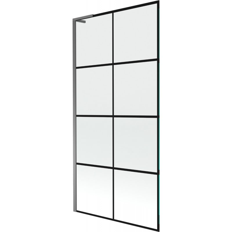 Technické údaje: Šířka: 90 cm Výška: 150 cm Typ: 1-křídlé Montáž: Univerzální Typ: Pevné Typ skla: Tvrzené Barva skla: Černá mřížka Tloušťka skla: 6 mm Povrchová úprava: Stříbrná ocel Úhlový stabilizátor L: Nerezová ocel Povrchová úprava pro snadné čištění Vyrovnání nerovností stěny