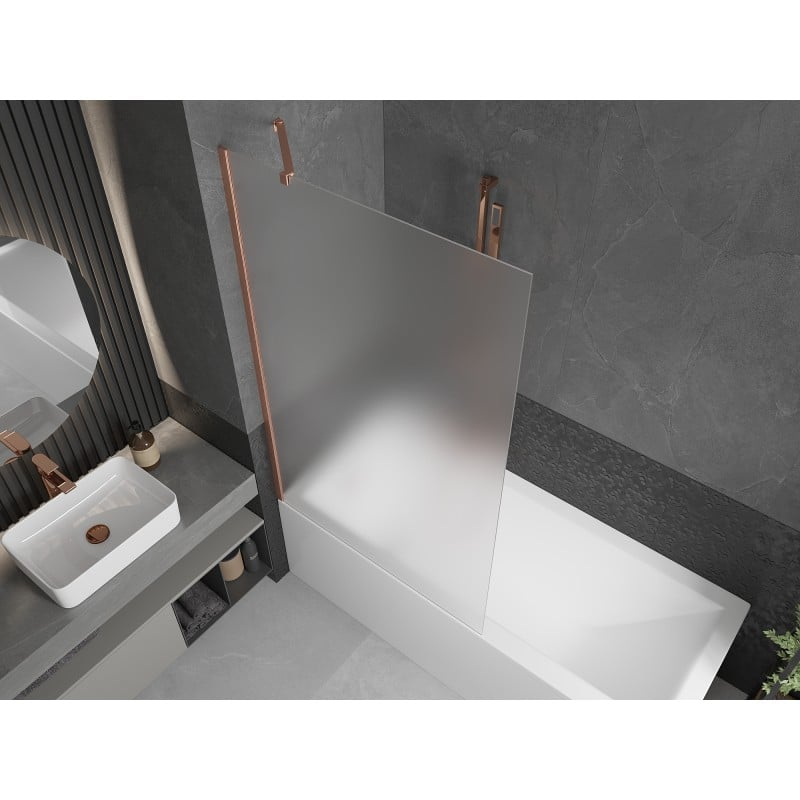 Technické údaje: Šířka: 100 cm Výška: 150 cm Typ: 1-křídlé Montáž: Univerzální Typ: Pevné Typ skla: Tvrzené Barva skla: Mléčné Tloušťka skla: 6 mm Povrchová úprava: Kartáčovaná měď Povlak pro snadné čištění Vyrovnání nerovností stěn