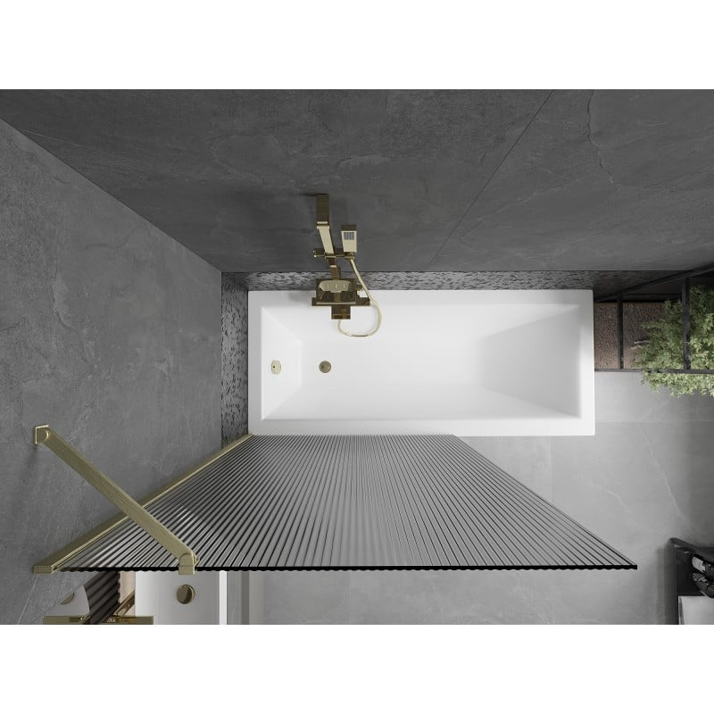 Technické údaje: Šířka: 100 cm Výška: 150 cm Typ: 1-křídlé Montáž: Univerzální Typ: Pevné Typ skla: Tvrzené Barva skla: Pruhy Tloušťka skla: 6 mm Povrchová úprava: Kartáčované zlato Povlak pro snadné čištění Vyrovnání nerovností stěn