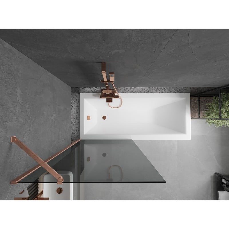 Technické údaje: Šířka: 80 cm Výška: 150 cm Typ: 1-křídlé Montáž: Univerzální Typ: Pevné Typ skla: Tvrzené Barva skla: Grafit Tloušťka skla: 6 mm Povrchová úprava: Kartáčovaná měď Povlak pro snadné čištění Vyrovnání nerovností stěn
