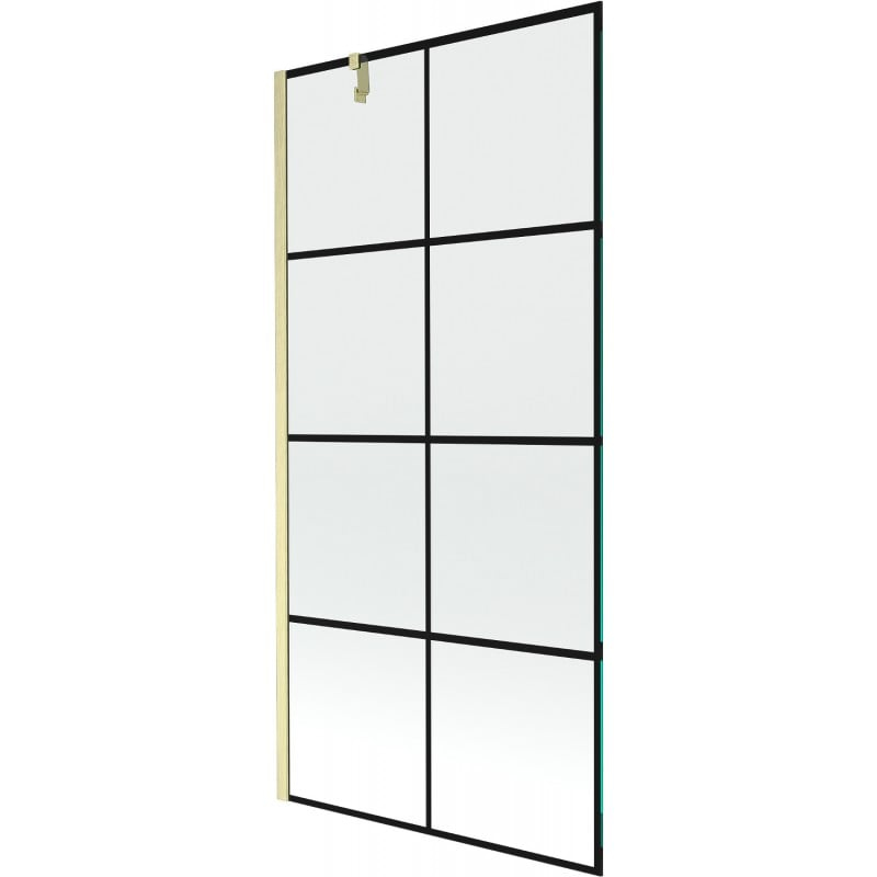 Technické údaje: Šířka: 90 cm Výška: 150 cm Typ: 1-křídlé Montáž: Univerzální Typ: Pevné Typ skla: Tvrzené Barva skla: Černá mřížka Tloušťka skla: 6 mm Povrchová úprava: Kartáčované zlato Povlak pro snadné čištění Vyrovnání nerovností stěn