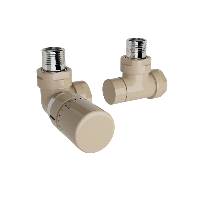 Ventil Zehnder úhlový rohový, rohové šroubení pro zpátečku 1/2", s termostatickou hlavicí Design Line, Set I, RAL 0523 beige quartz, Z-839729-0523