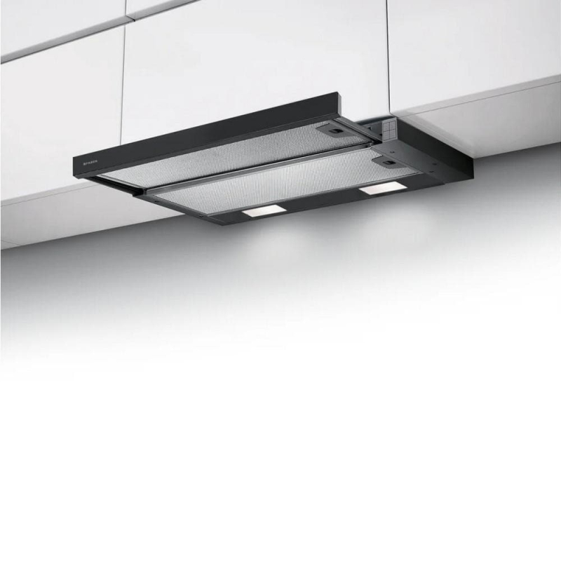 Vestavná výsuvná digestoř Faber FLEXA HIP NG BK A50 (50 cm) v černém provedení s černou lištou. Spouští se automaticky při vysunutí, má 3 stupně výkonu až 420 m³/h, hlučnost 57–69 dB. 2× LED osvětlení, kovové tukové filtry do myčky. Záruka 5 let po registraci.